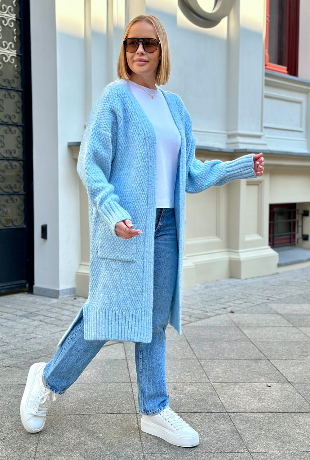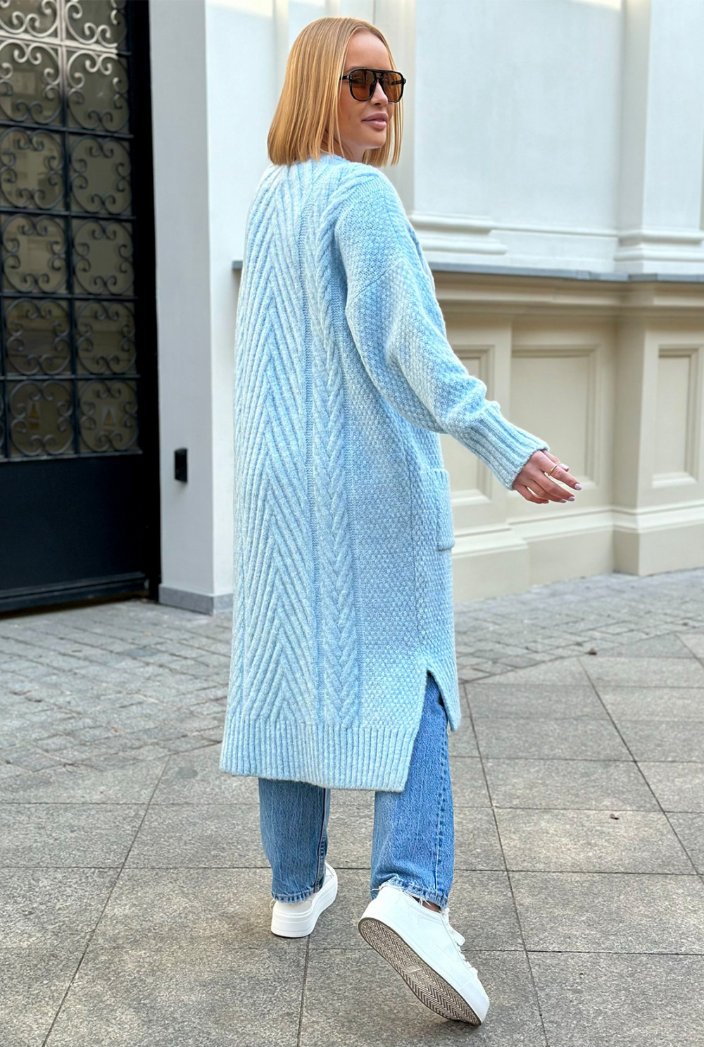 Wyjątkowo miękki kardigan z kieszeniami to propozycja, która koniecznie powinna znaleźć się w każdej garderobie! Model o asymetrycznym kroju, posiada ozdobny splot na plecach. Świetnie dopełni codzienne looki na chłodniejsze dni.