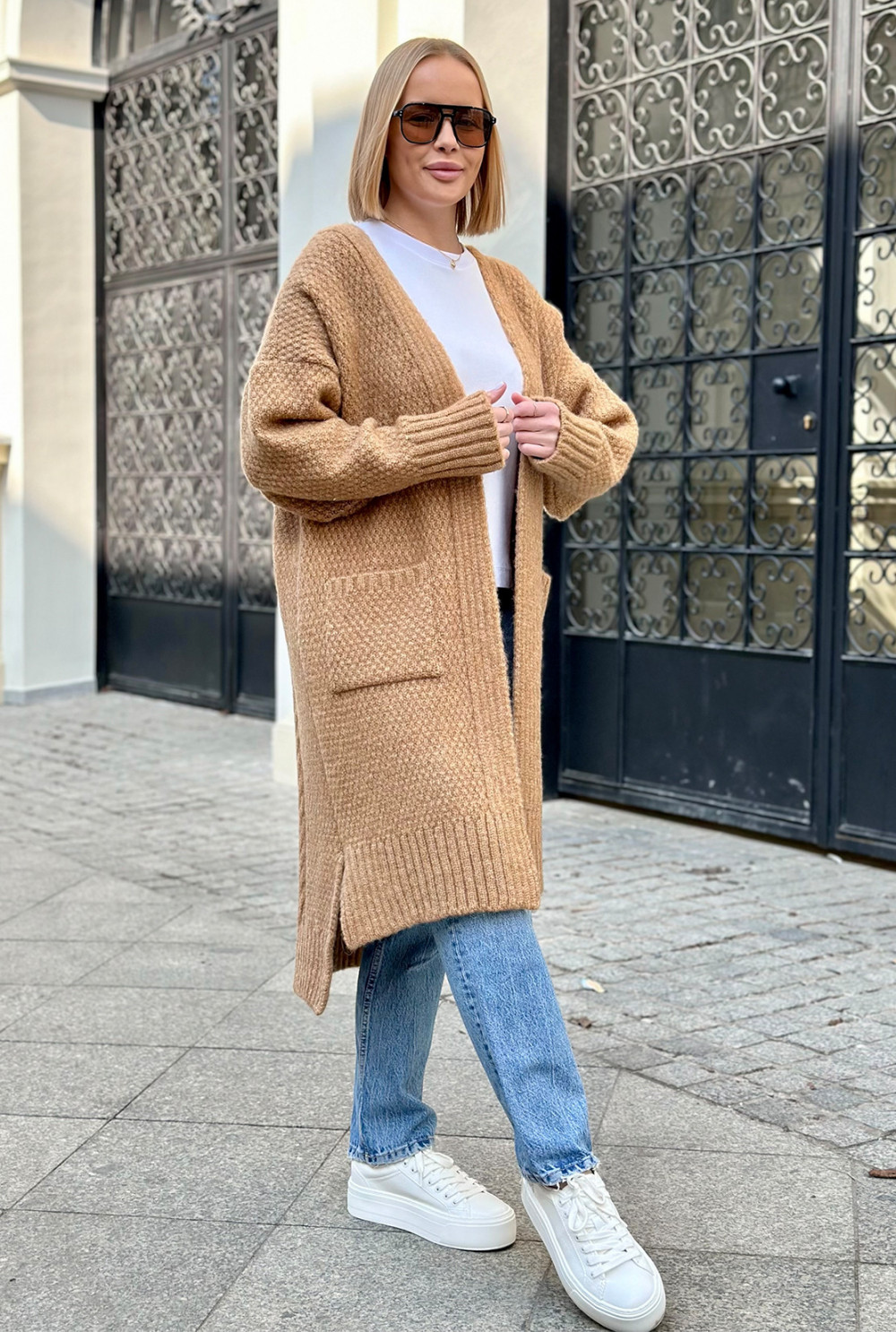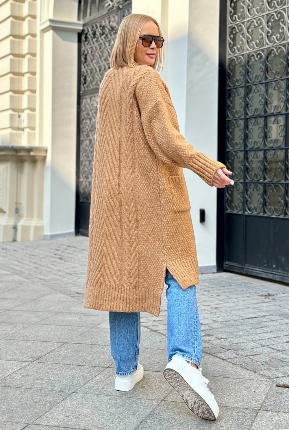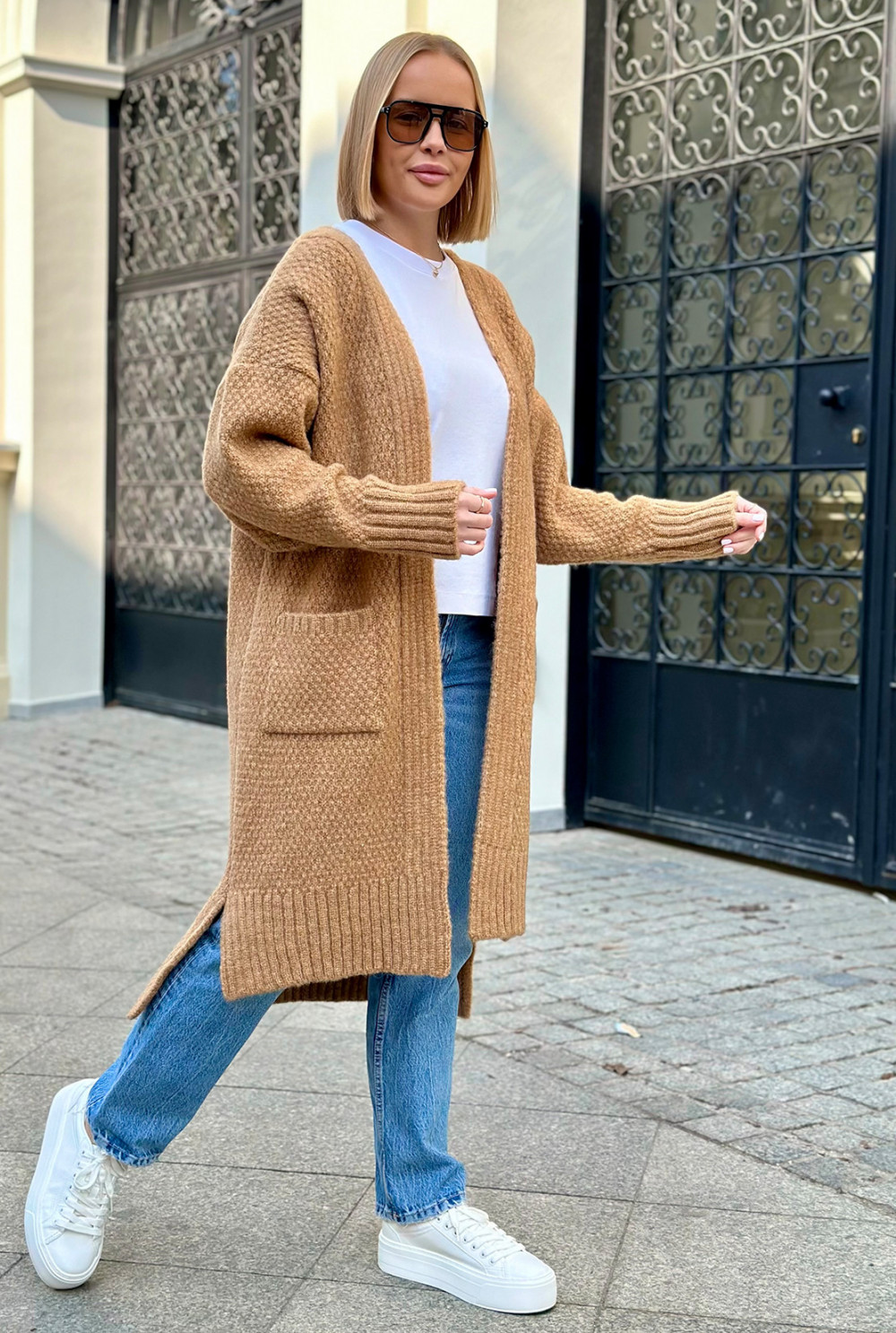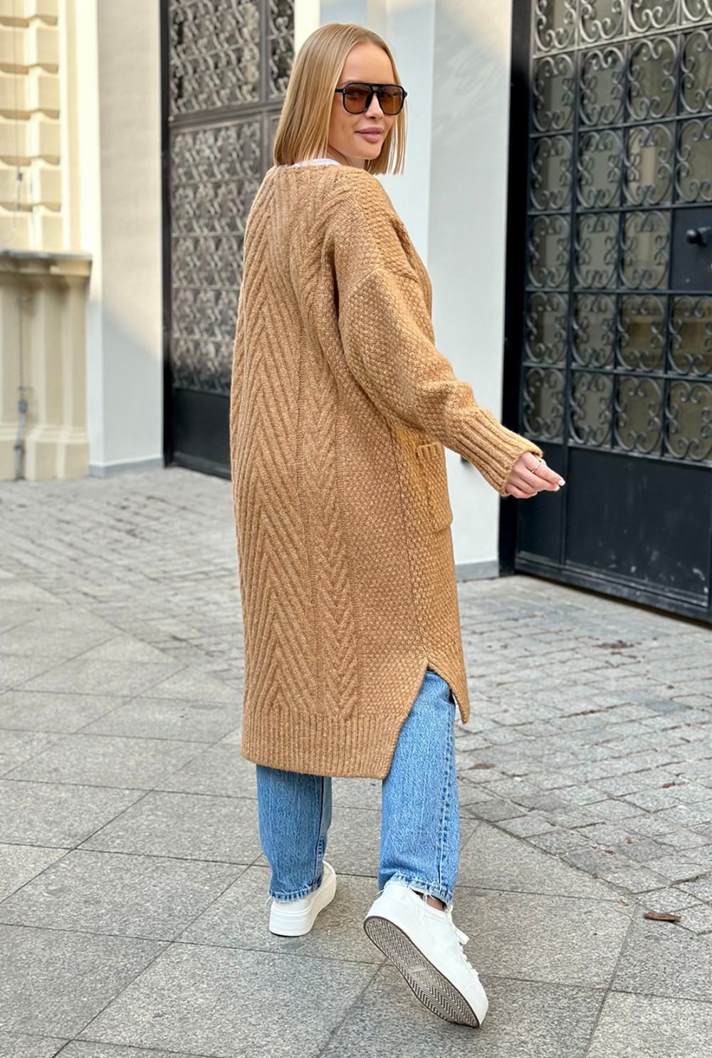 Wyjątkowo miękki kardigan z kieszeniami to propozycja, która koniecznie powinna znaleźć się w każdej garderobie! Model o asymetrycznym kroju, posiada ozdobny splot na plecach. Świetnie dopełni codzienne looki na chłodniejsze dni.