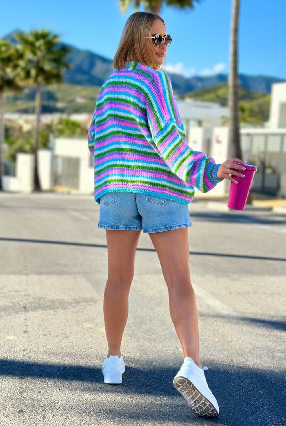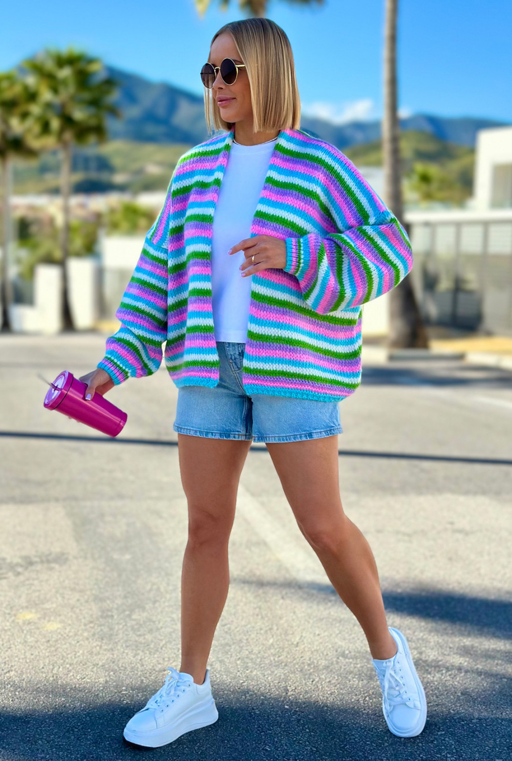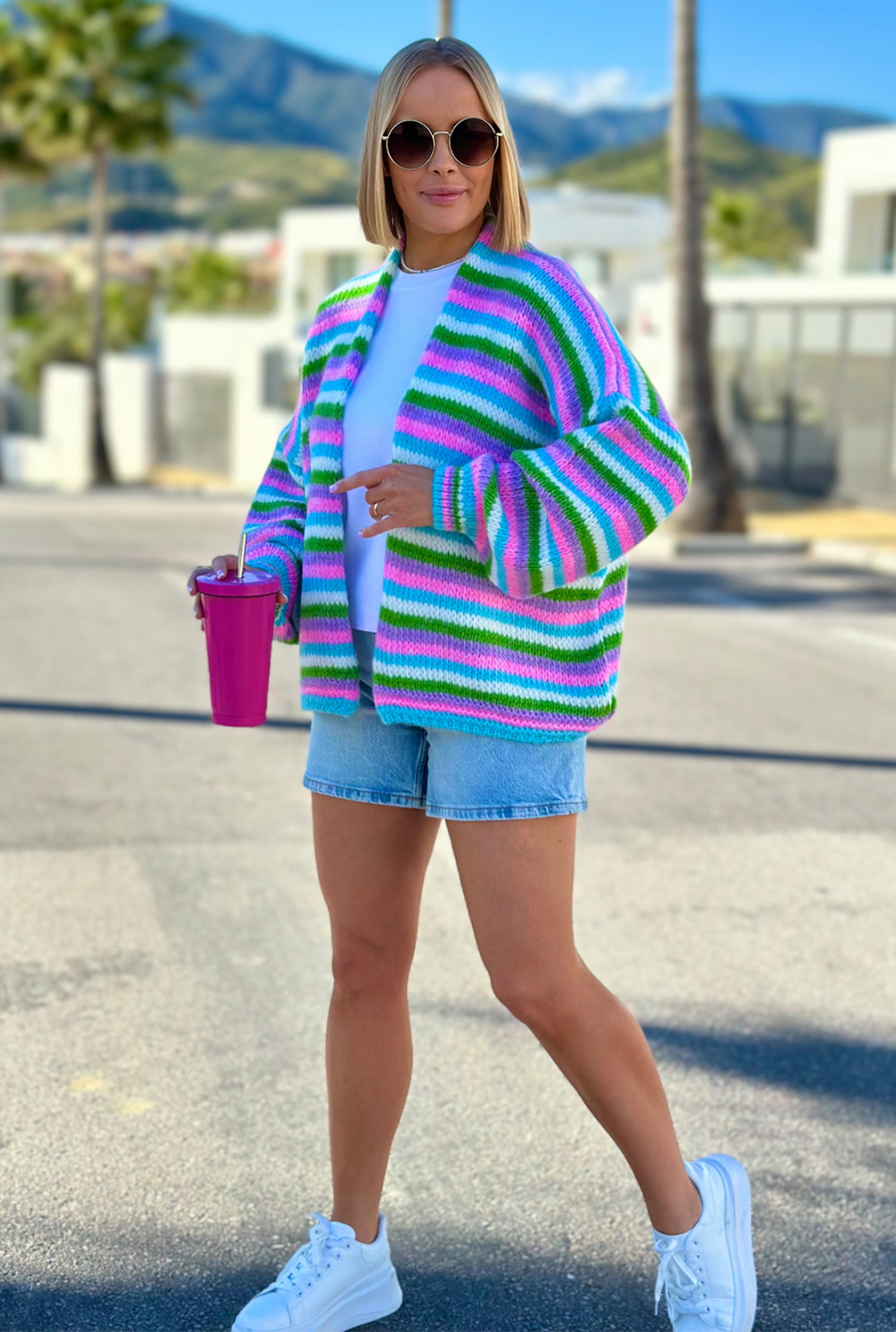 Lekki kardigan w kolorowe pasy z domieszką wełny to świetna propozycja na chłodniejsze dni. To krótki, niezapinany model z obniżoną linią ramion. Rękawy, jak i dół zakończone zostały ściągaczami.