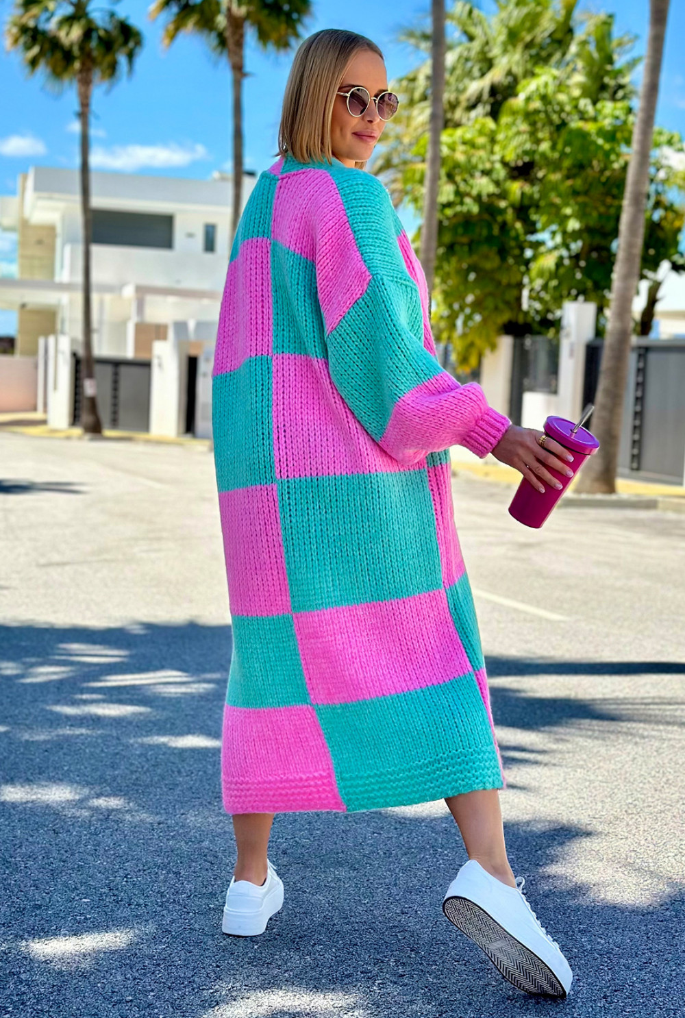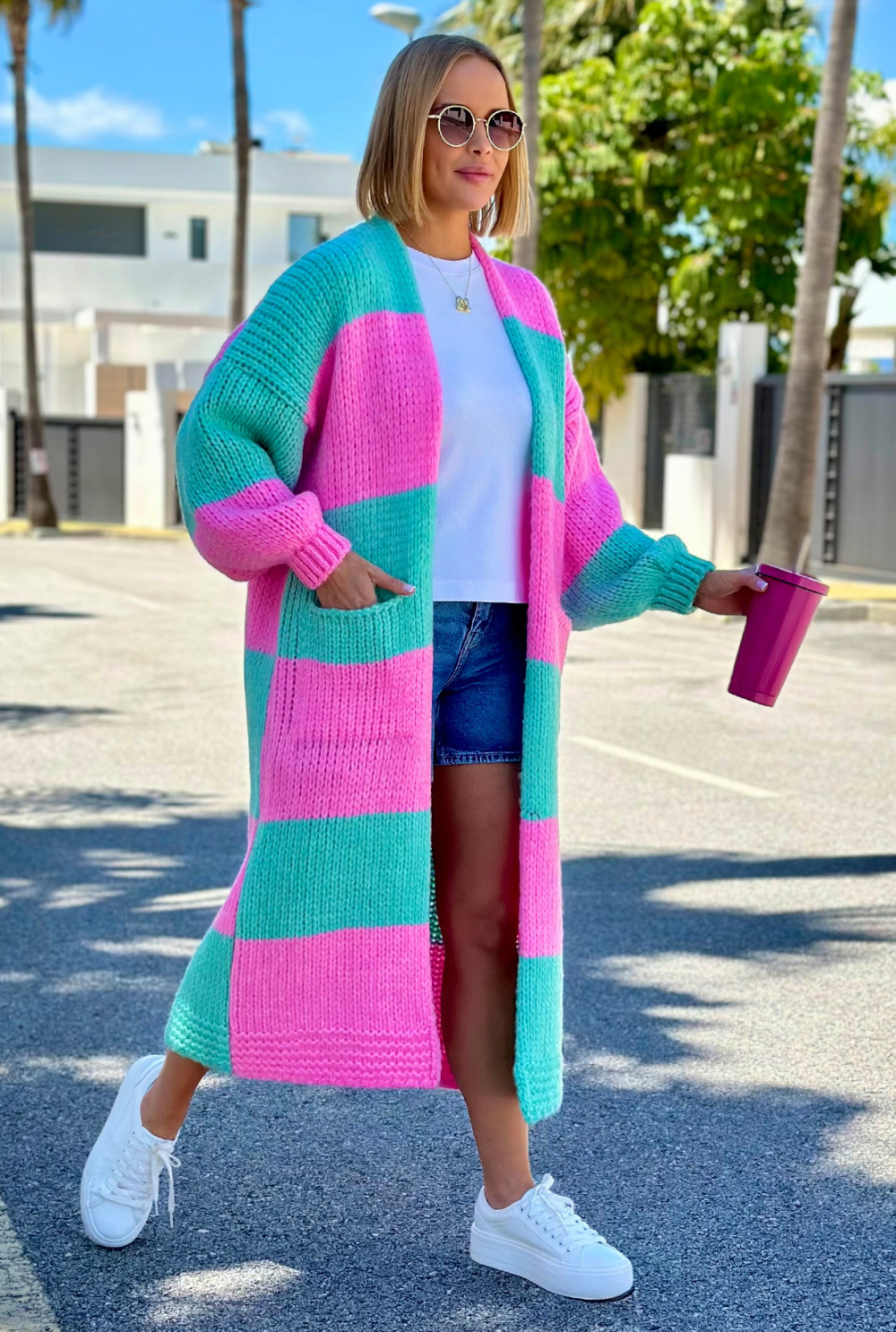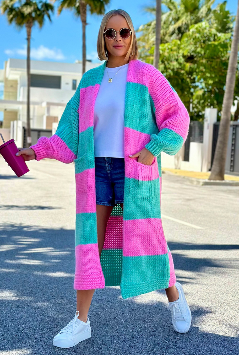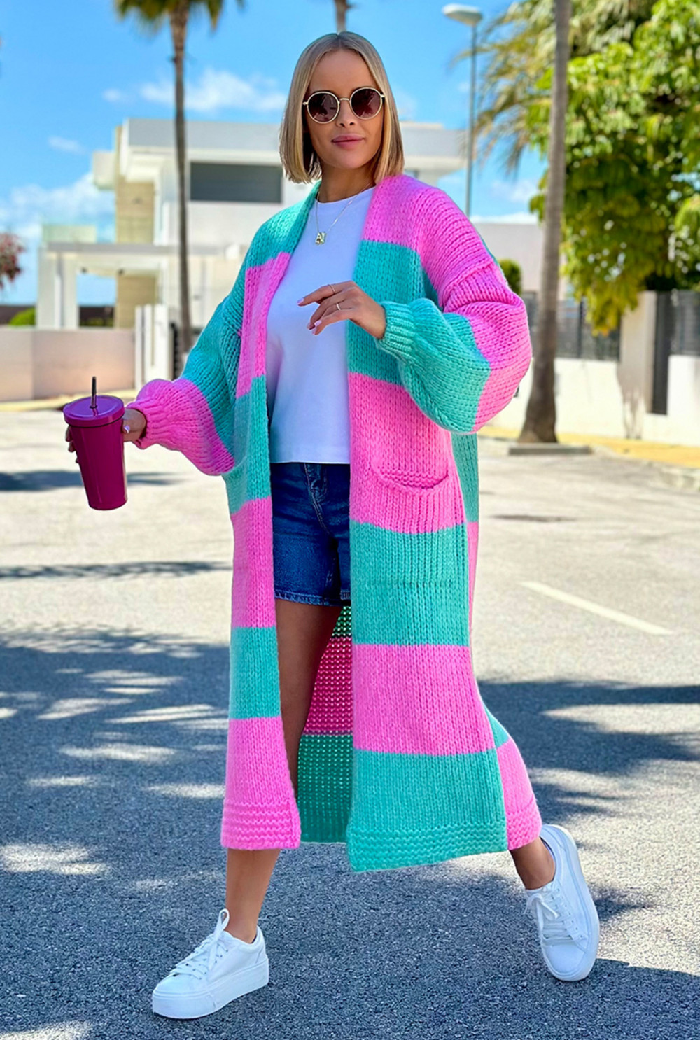 Długi kardigan oversize Agnes Baby róż-seledyn