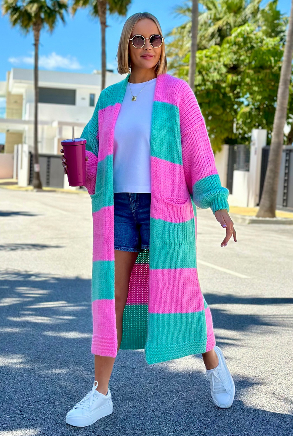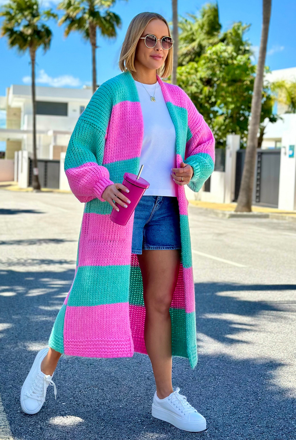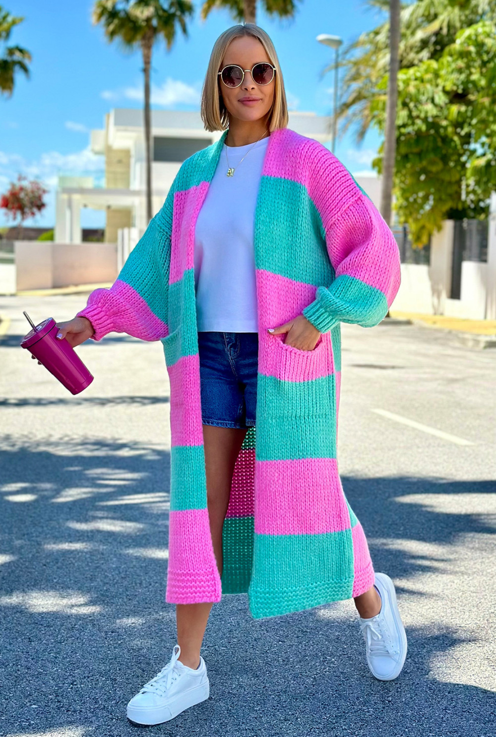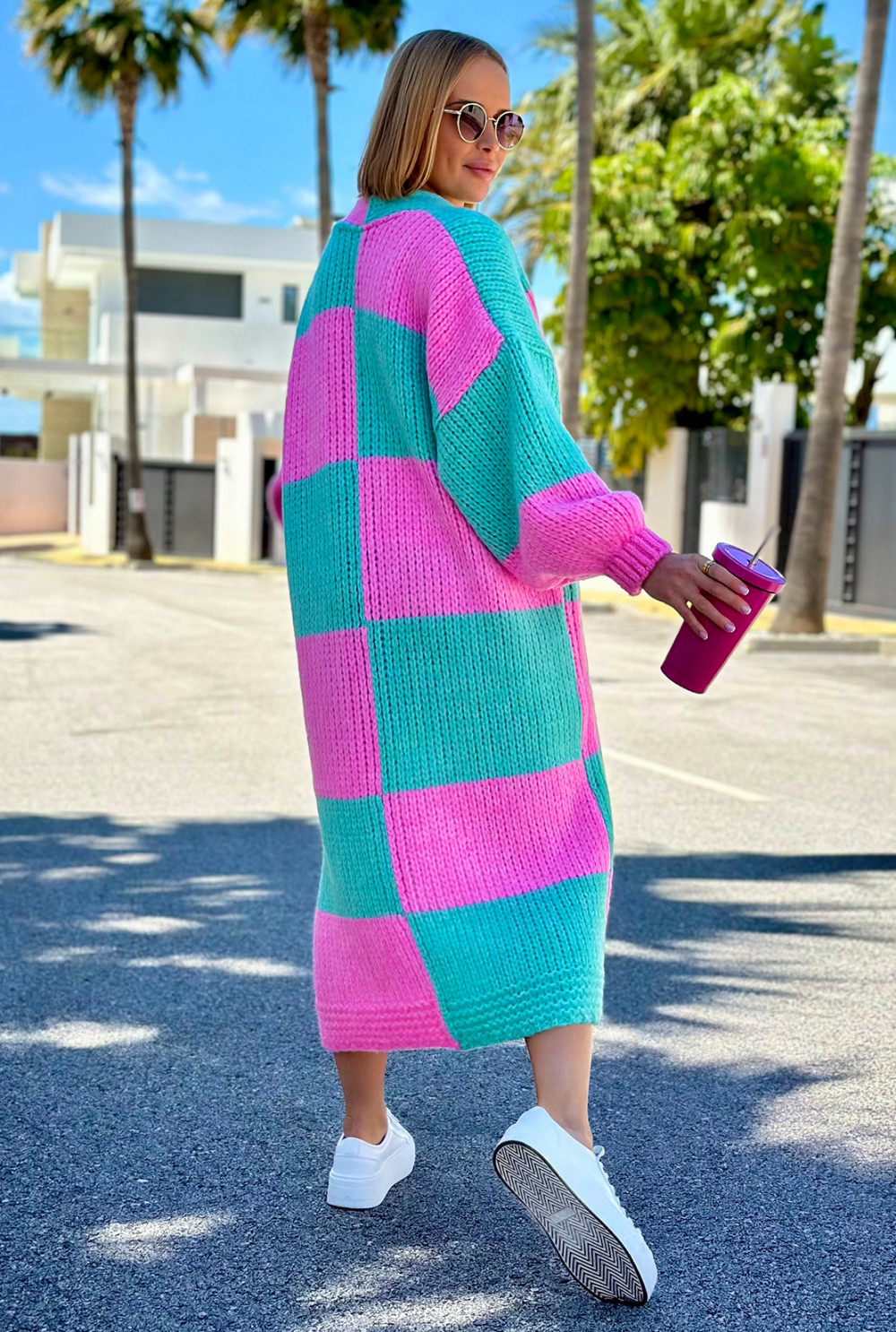 Długi kardigan oversize Agnes Baby róż-seledyn