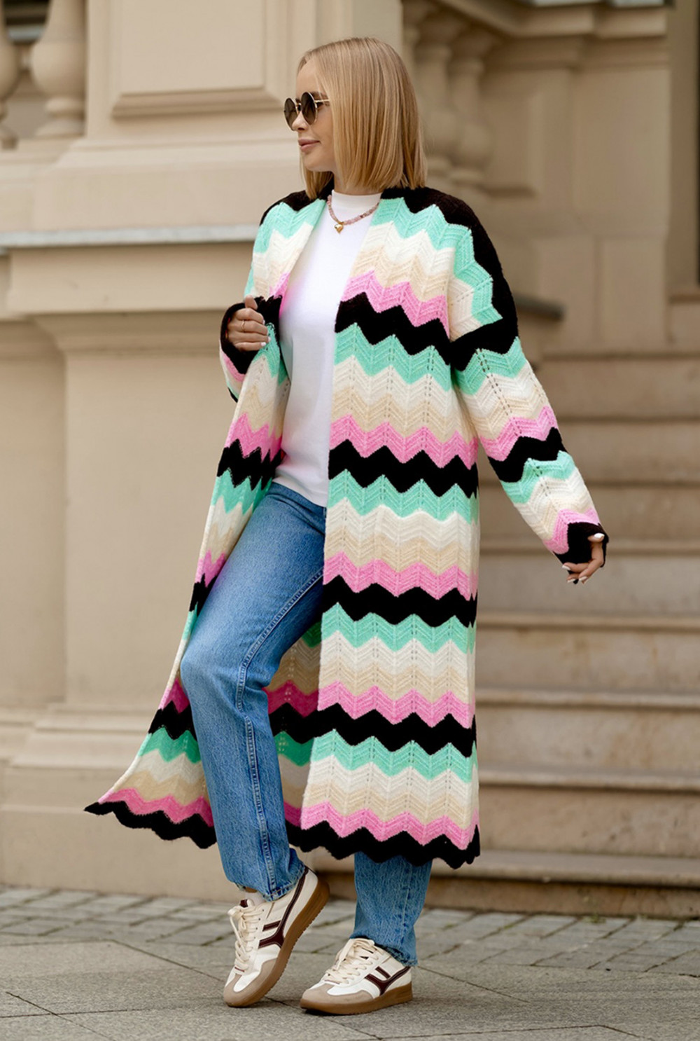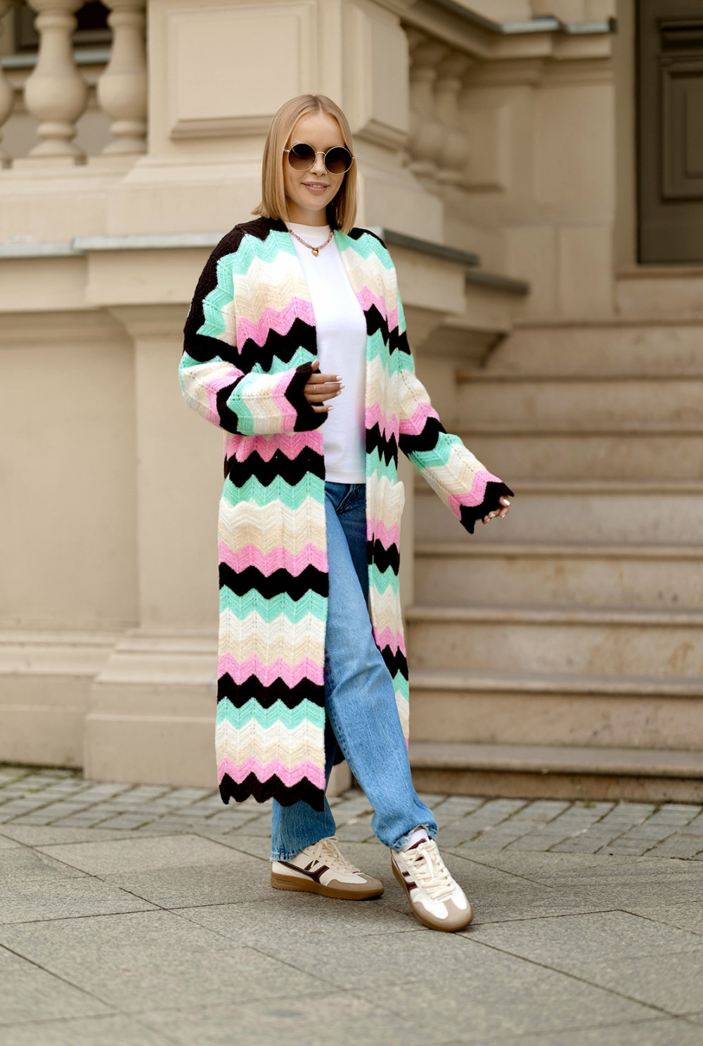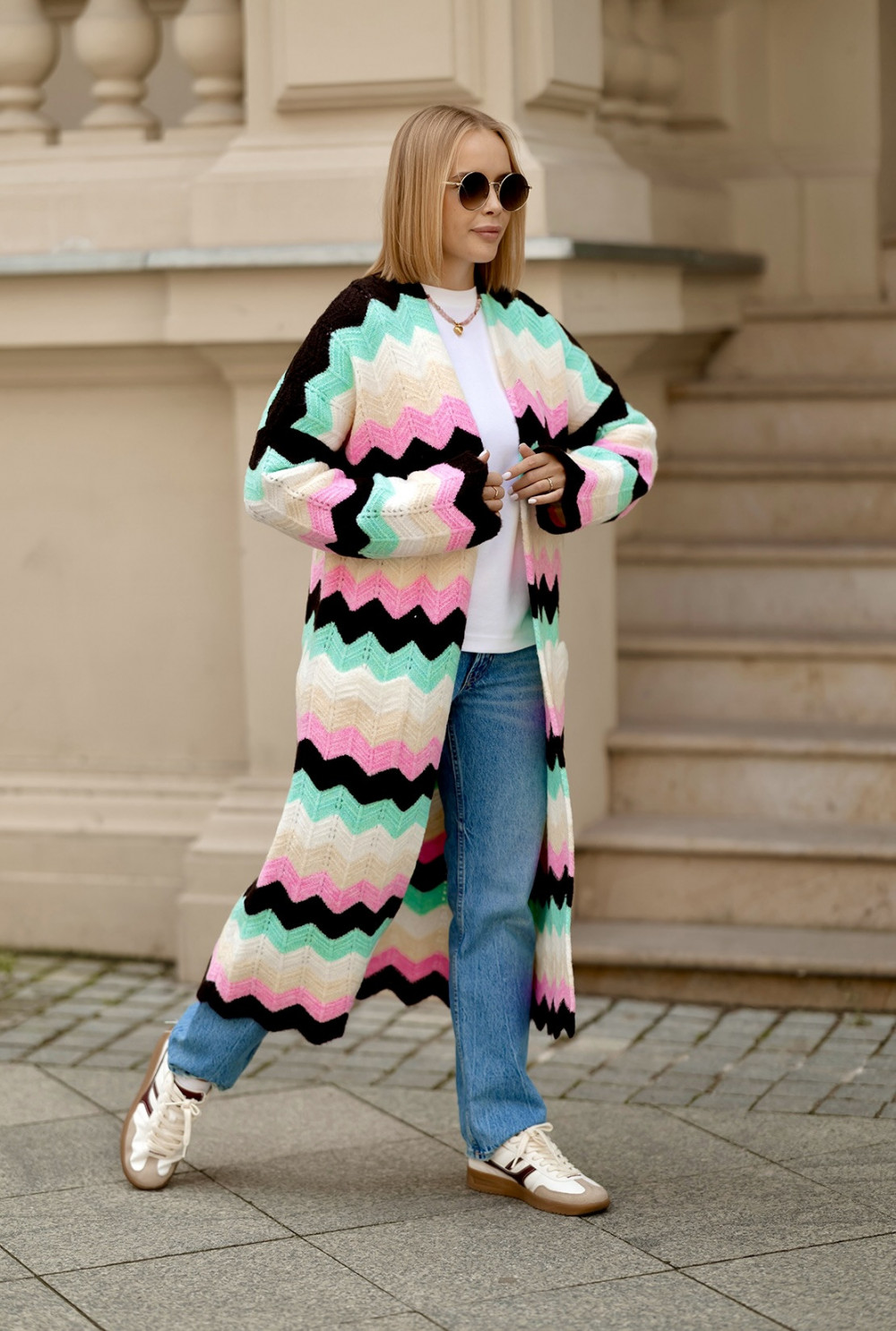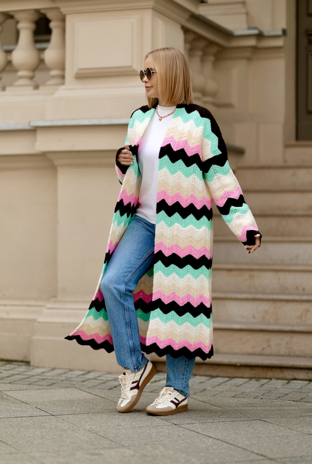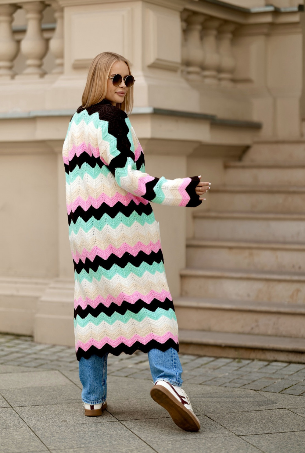 Długi kardigan o luźnym, oversizowym fasonie to absolutny must-have w każdej szafie! Zachwyca nietuzinkowym zestawieniem kolorów oraz szerokimi rękawami. Posiada praktyczne, naszywane kieszenie po bokach. Ten model idealnie dopełni casualowe stylizacje, zapewniając komfort i swobodę każdego dnia.