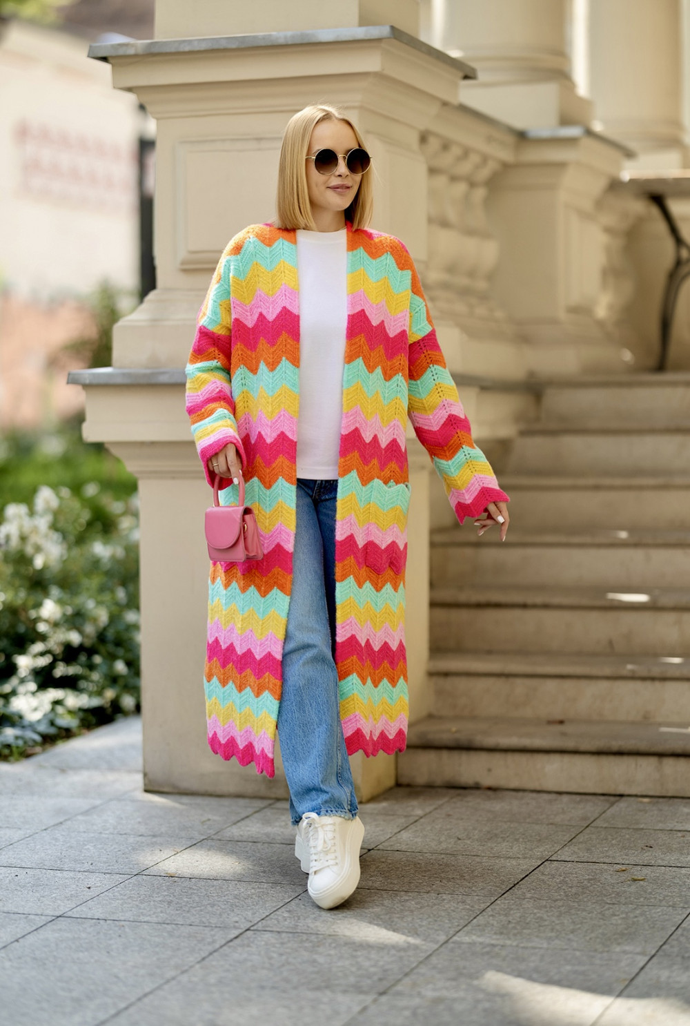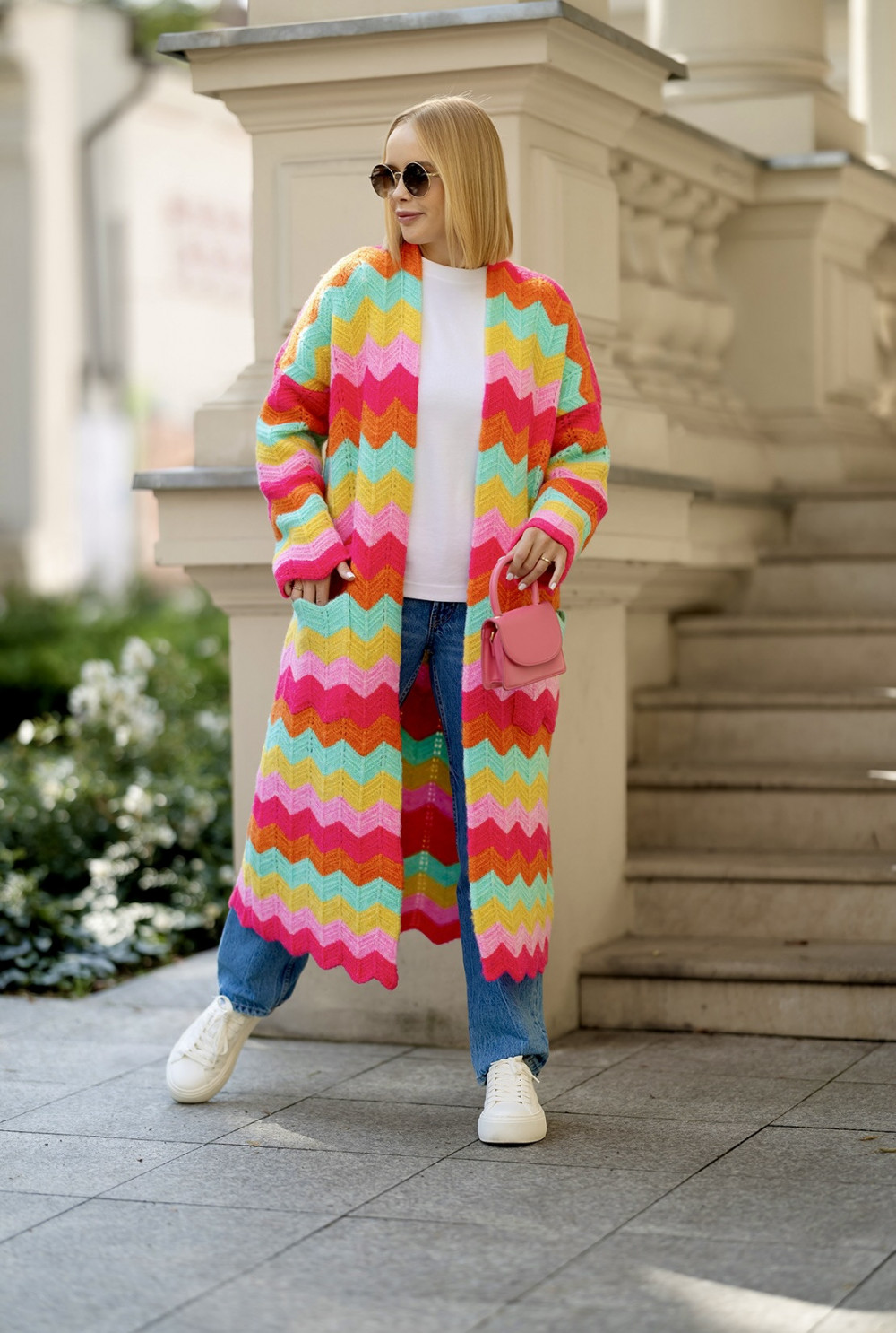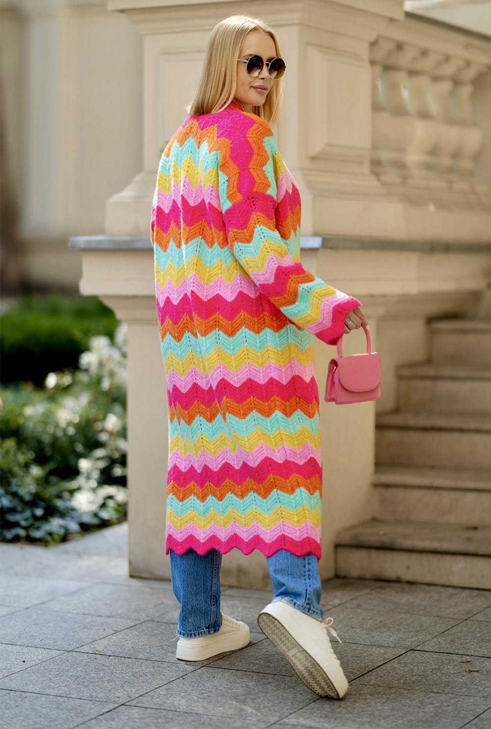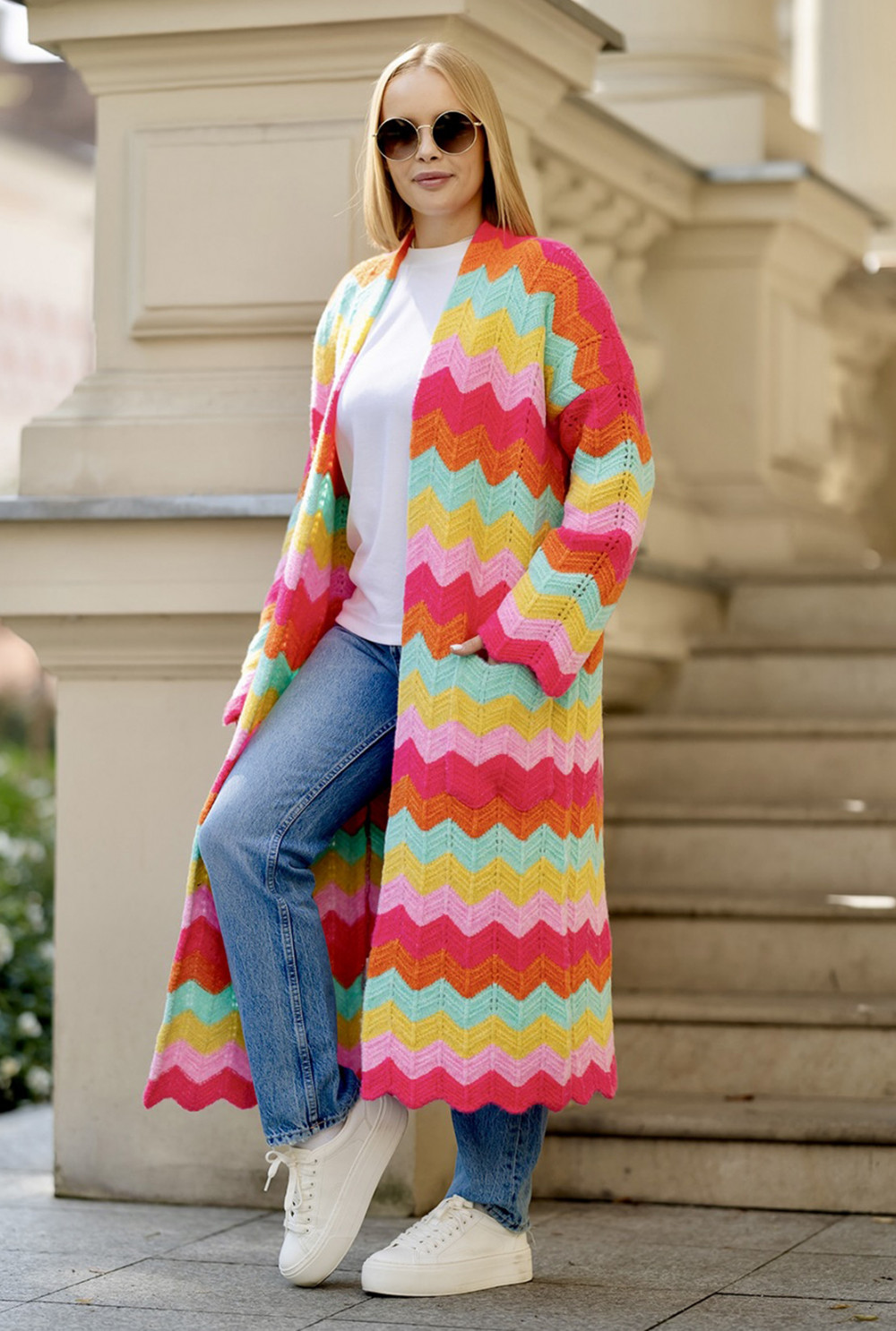 Długi kardigan o luźnym, oversizowym fasonie to absolutny must-have w każdej szafie! Zachwyca nietuzinkowym zestawieniem kolorów oraz szerokimi rękawami. Posiada praktyczne, naszywane kieszenie po bokach. Ten model idealnie dopełni casualowe stylizacje, zapewniając komfort i swobodę każdego dnia.