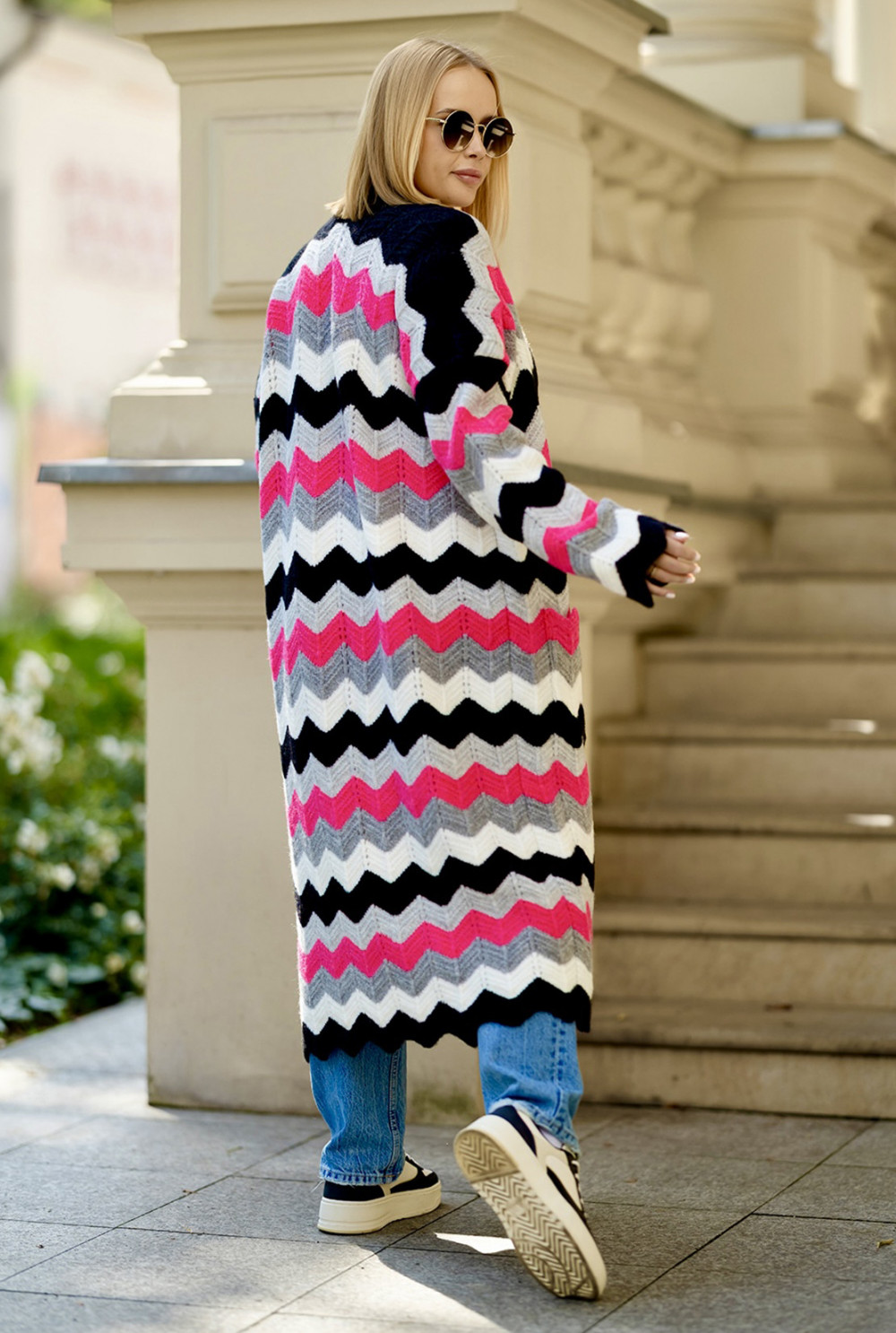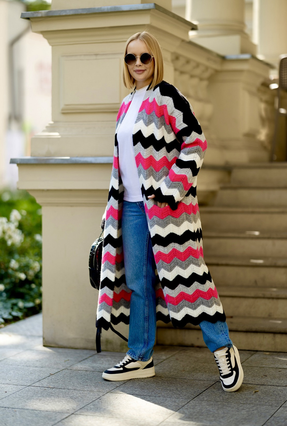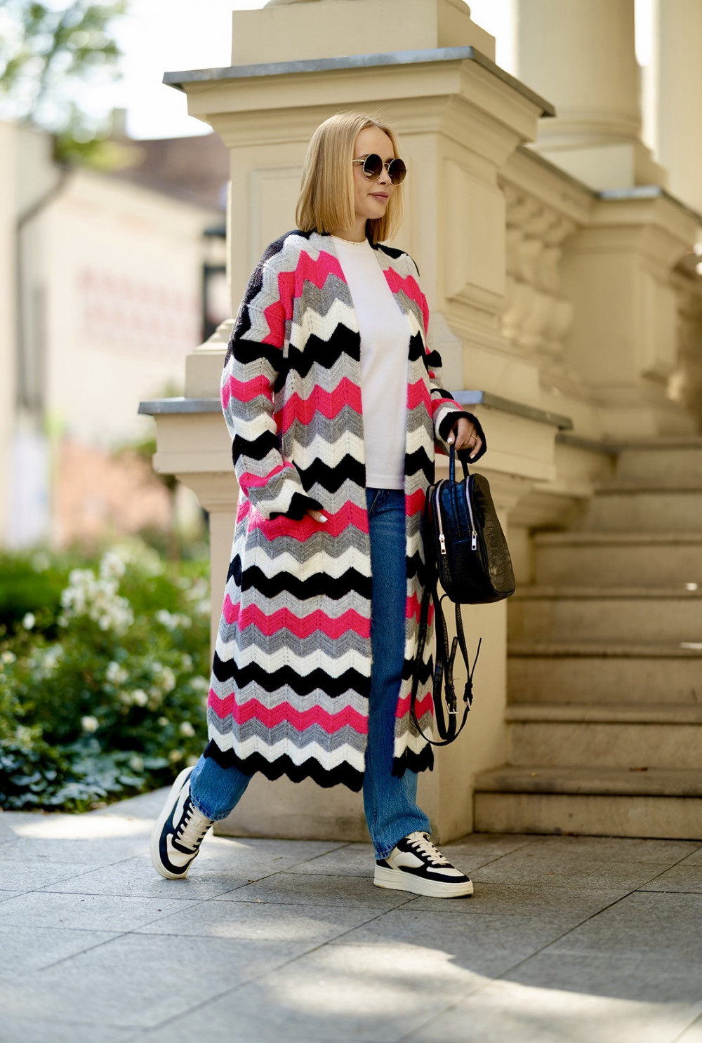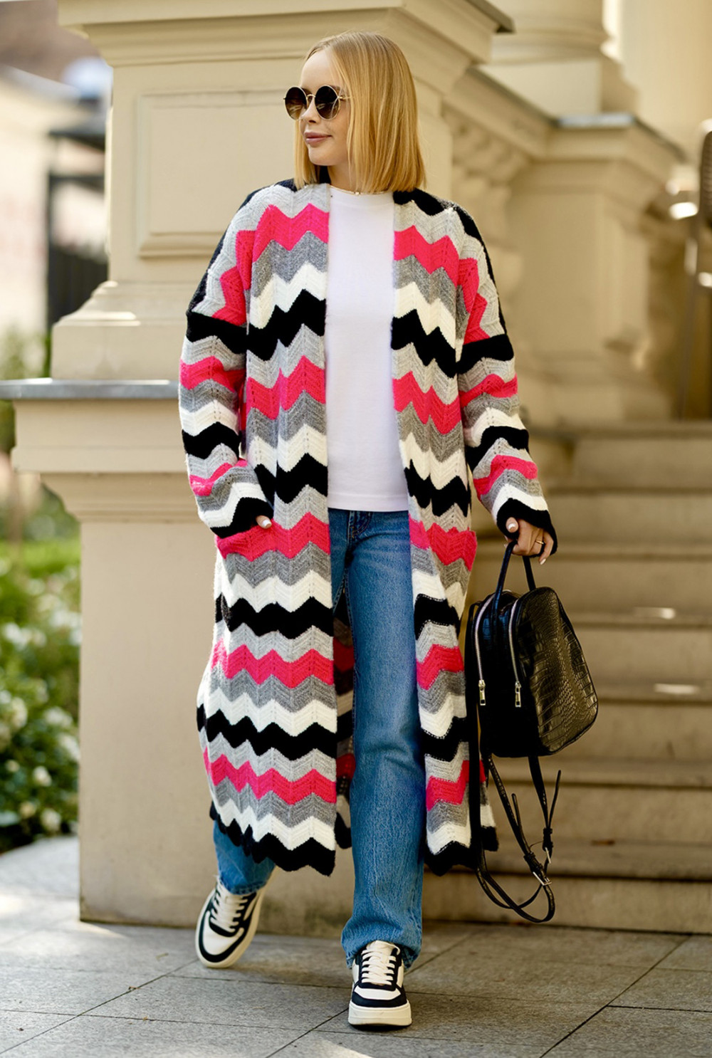 Długi kardigan o luźnym, oversizowym fasonie to absolutny must-have w każdej szafie! Zachwyca nietuzinkowym zestawieniem kolorów oraz szerokimi rękawami. Posiada praktyczne, naszywane kieszenie po bokach. Ten model idealnie dopełni casualowe stylizacje, zapewniając komfort i swobodę każdego dnia.
