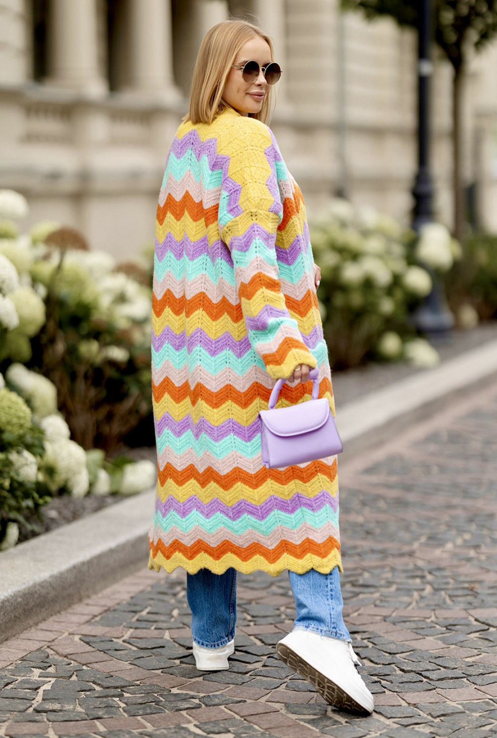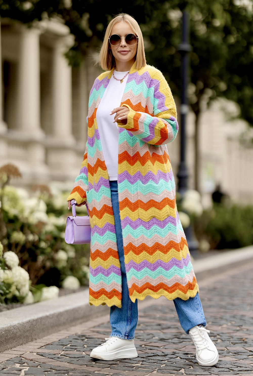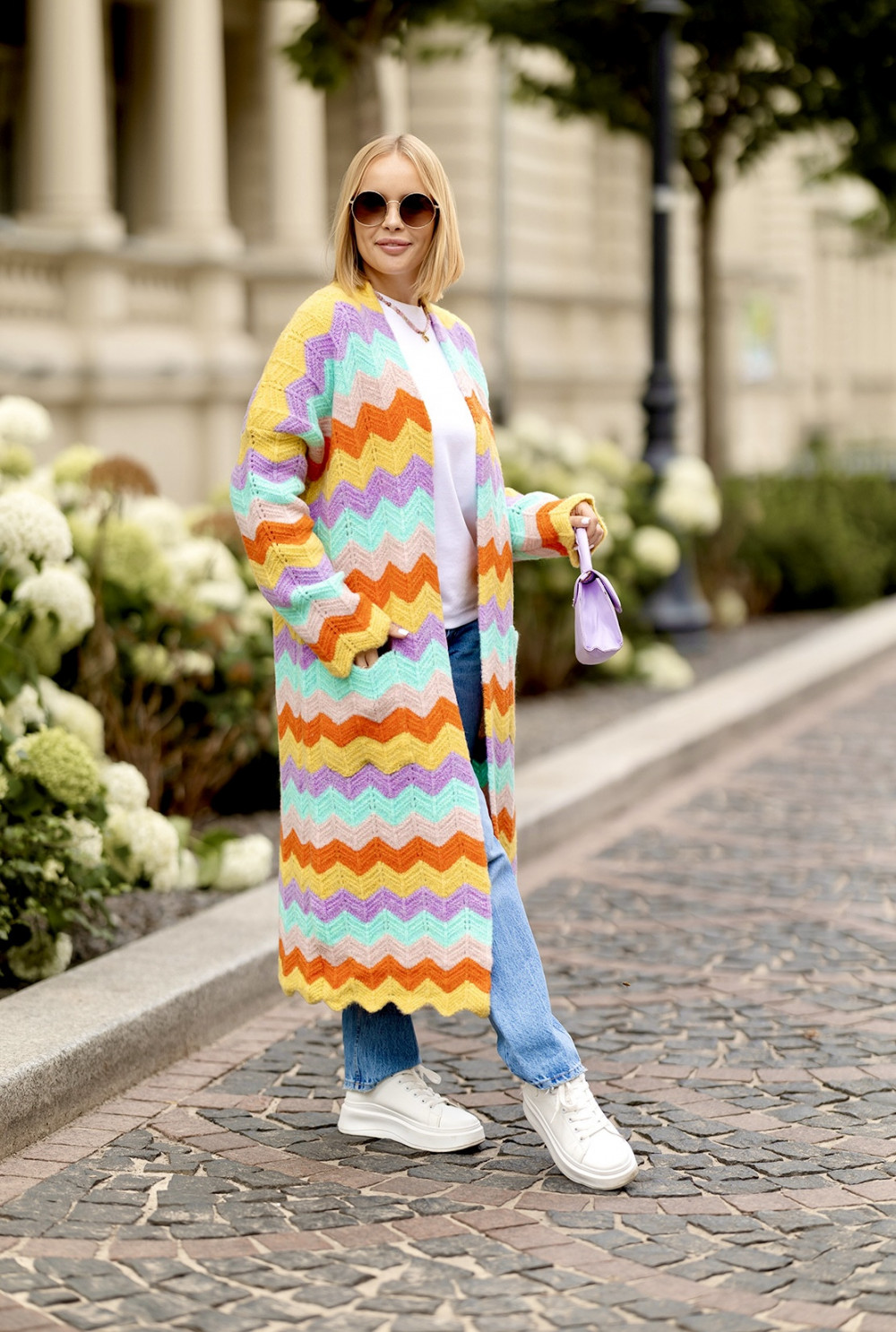 Długi kardigan o luźnym, oversizowym fasonie to absolutny must-have w każdej szafie! Zachwyca nietuzinkowym zestawieniem kolorów oraz szerokimi rękawami. Posiada praktyczne, naszywane kieszenie po bokach. Ten model idealnie dopełni casualowe stylizacje, zapewniając komfort i swobodę każdego dnia.