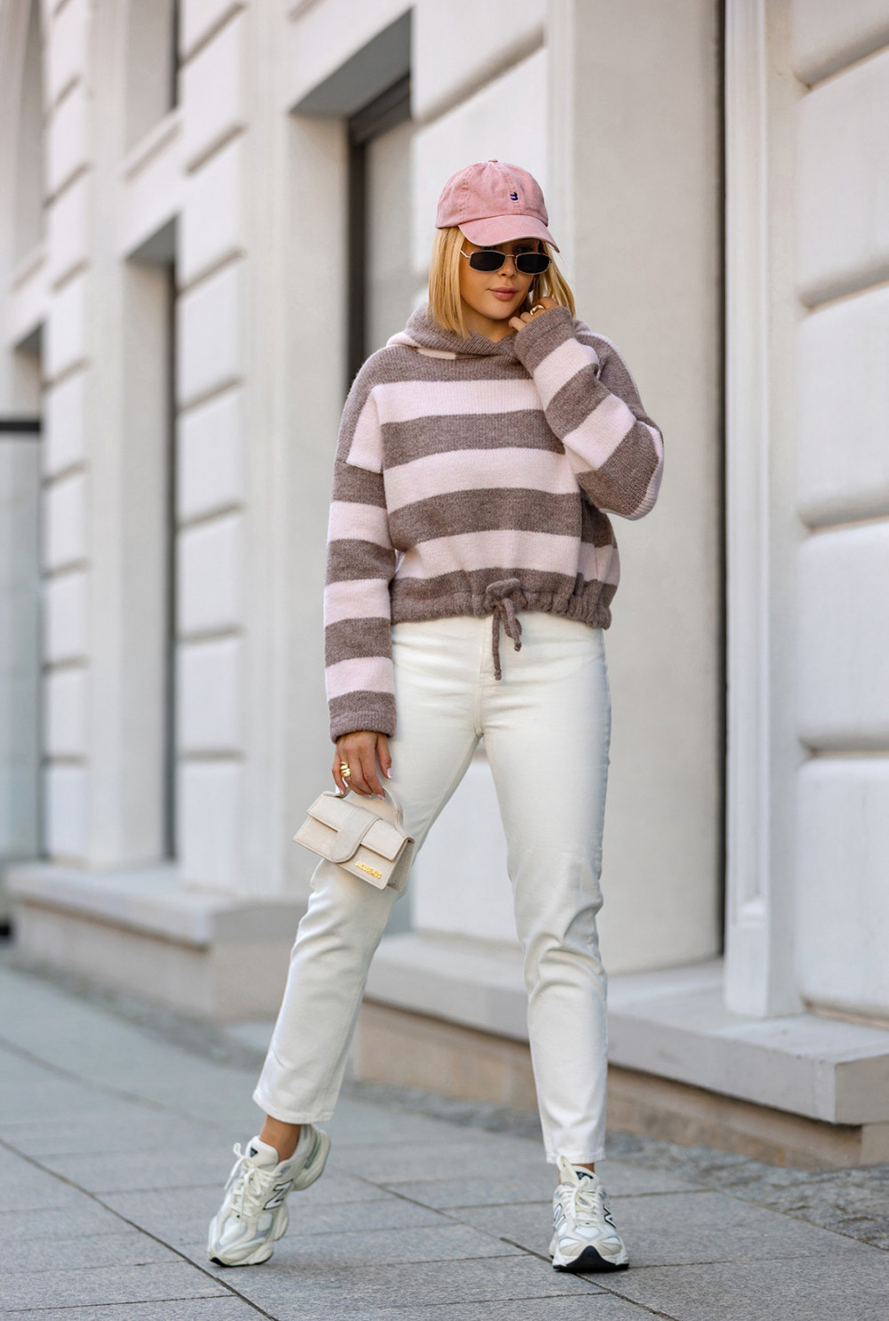 Krótki sweter oversize w paski z kapturem Harper Kakao-puder róż