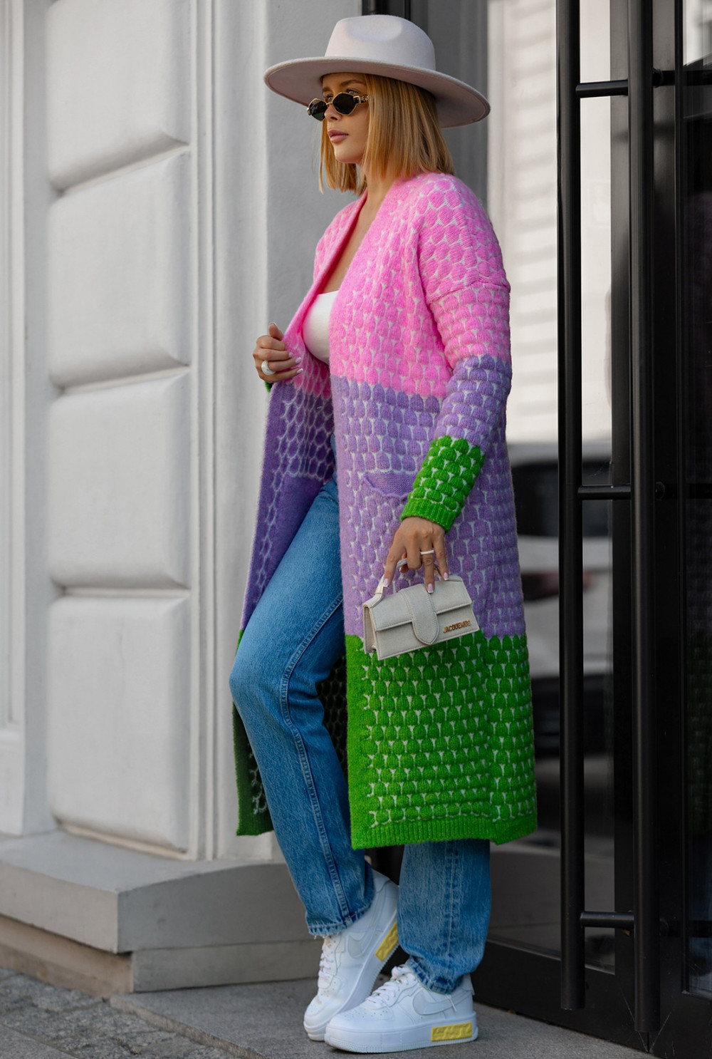 Długi kardigan o oversizowym kroju to niezastąpiony element garderoby! Wyróżnia się oryginalnym połączeniem barw i szerszymi rękawami. Model posiada kieszenie, które dodają mu praktyczności. Doskonale sprawdzi się w codziennych stylizacjach, gwarantując pełen komfort i luz na co dzień.