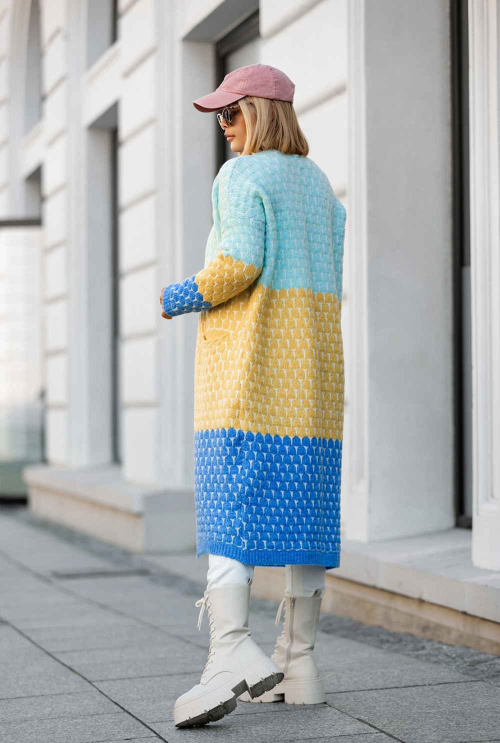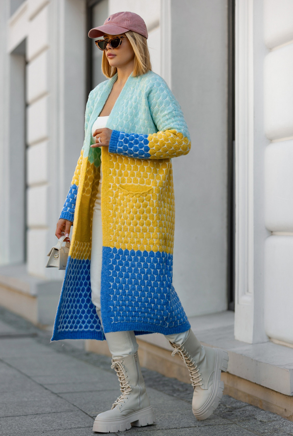 Długi kardigan z kieszeniami Becca Jasny turkus-cytryna-niebieski