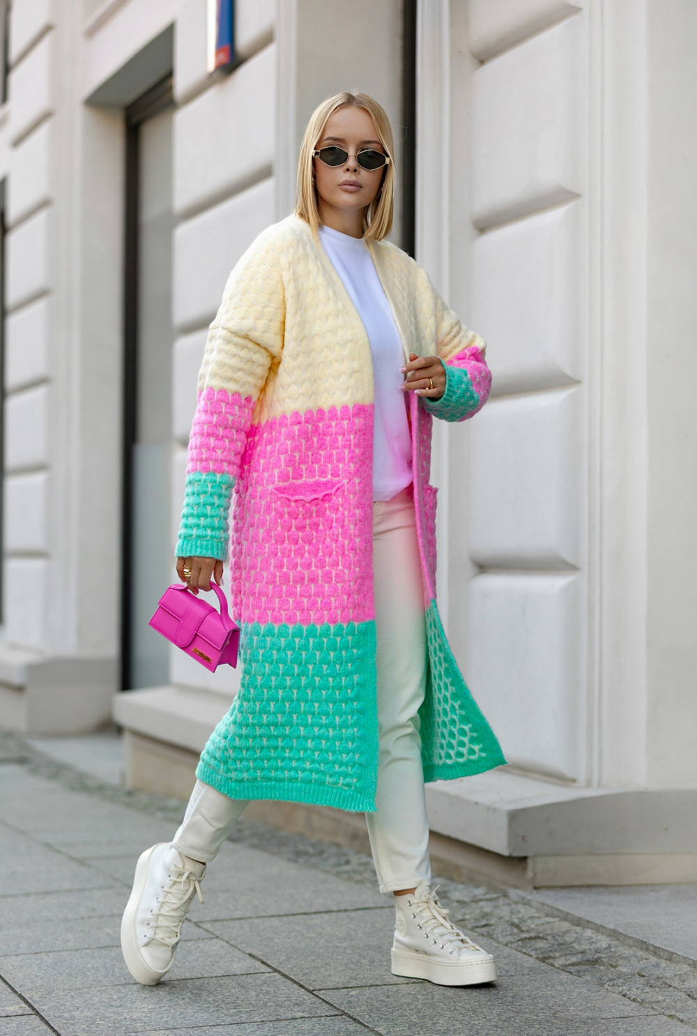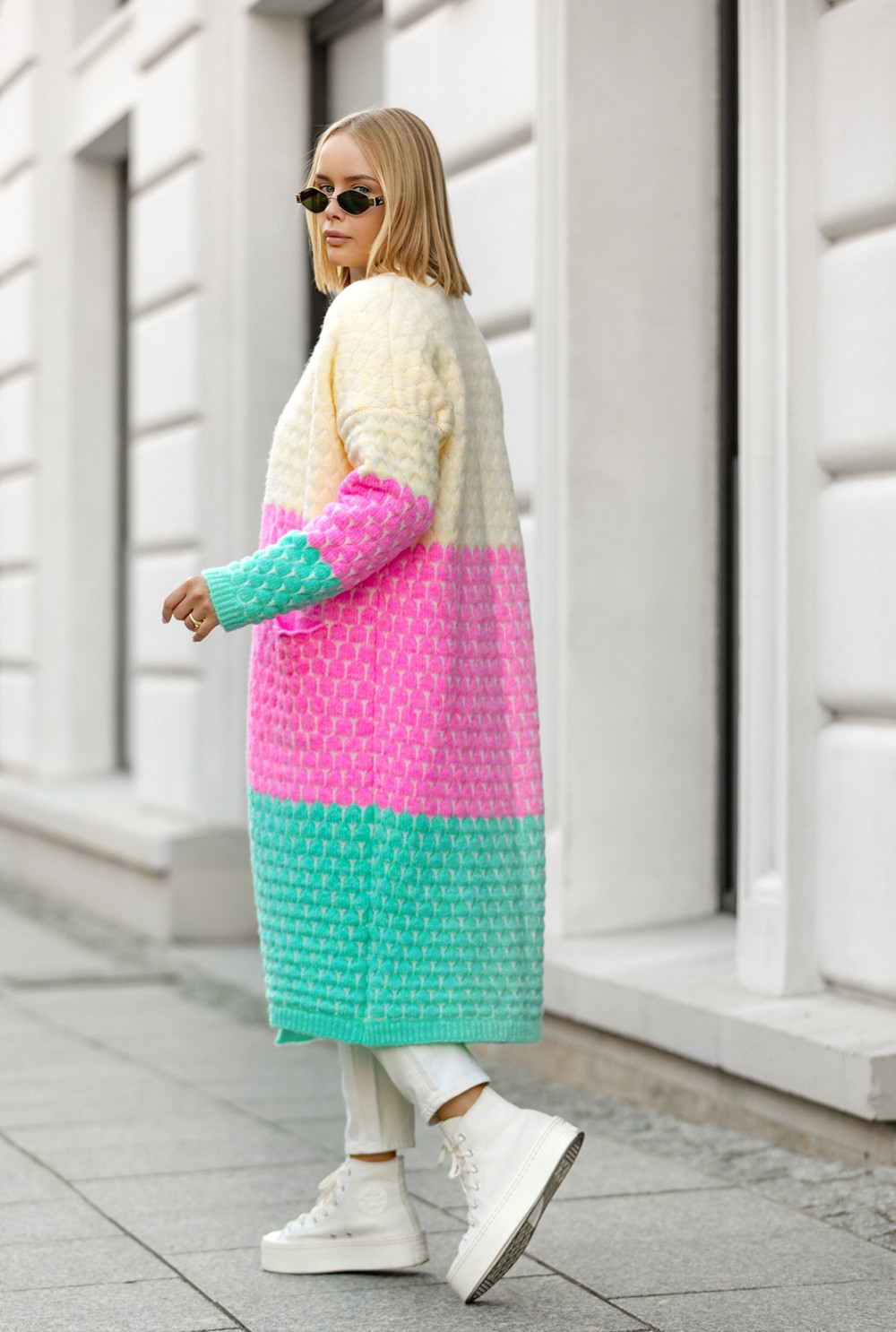 Długi kardigan z kieszeniami Becca Wanilia-baby róż-seledyn