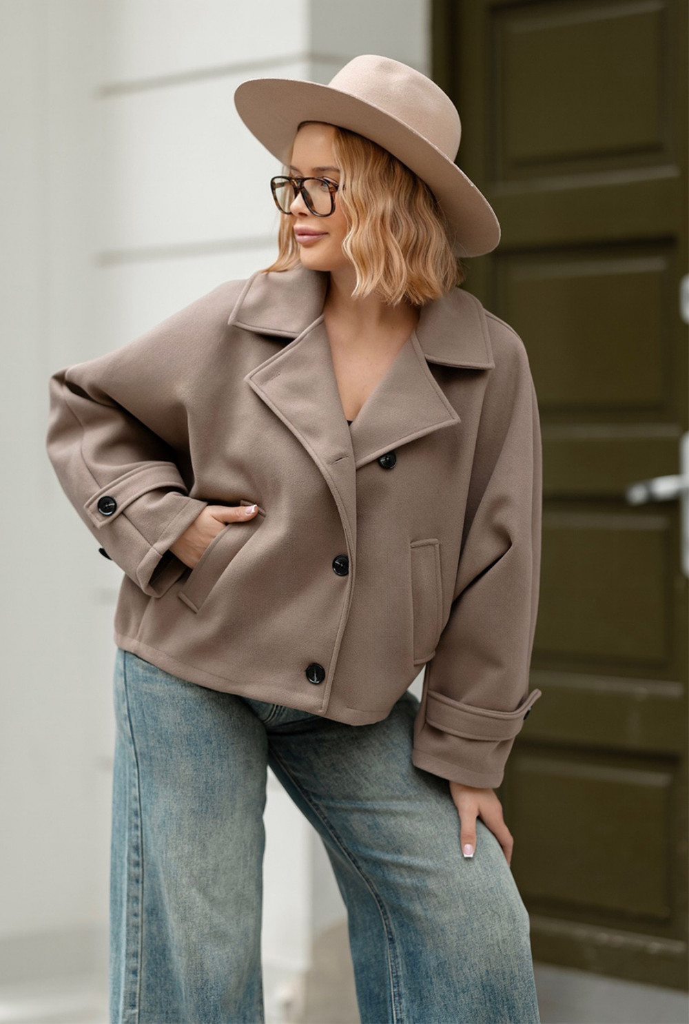 Krótki płaszcz uszyty z miękkiego i przyjemnego w dotyku materiału. Model zapinany na guziki, wyposażony z przodu w praktyczne kieszenie. Posiada klasyczny kołnierz oraz długie rękawy zakończone mankietami.