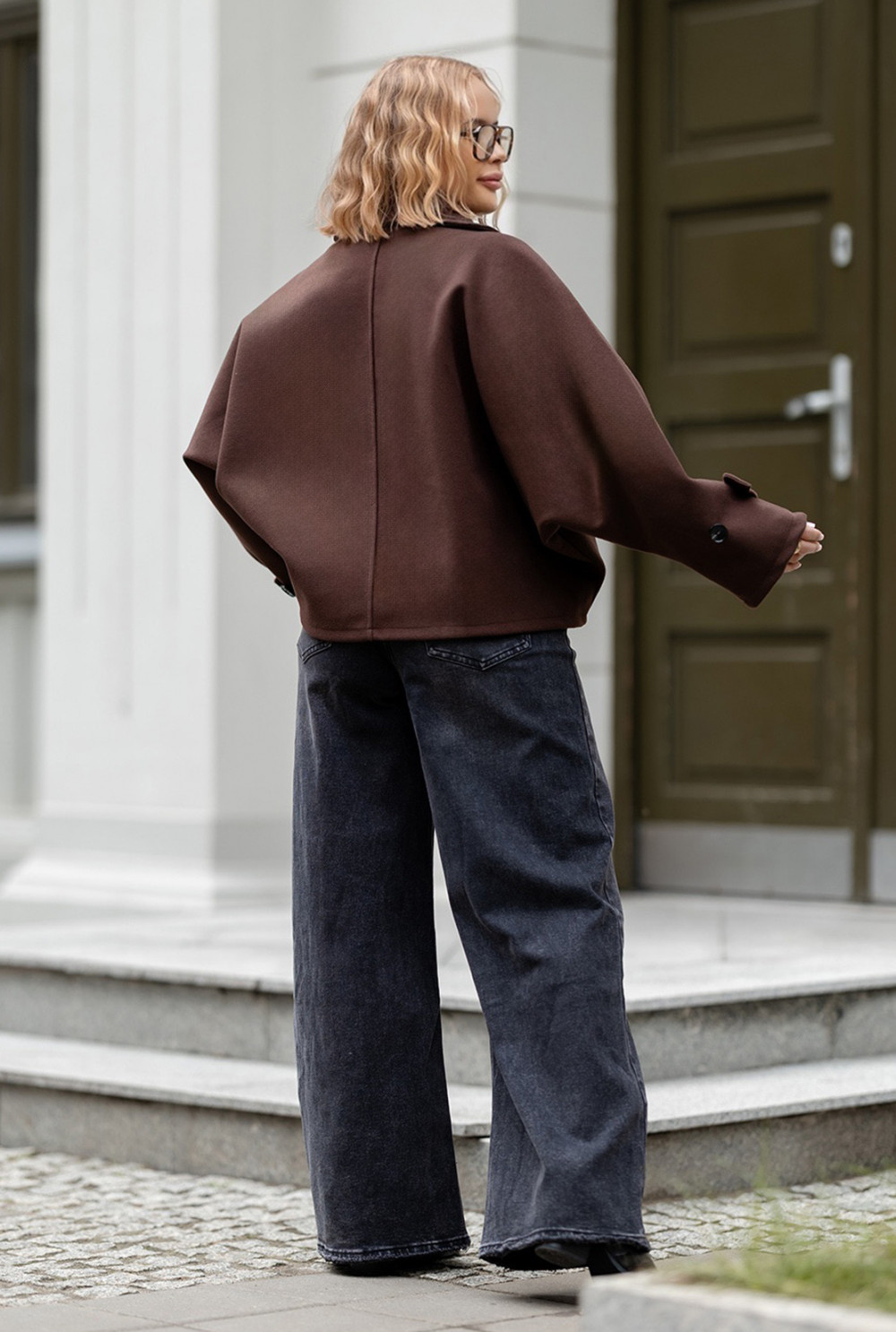 Krótki płaszcz uszyty z miękkiego i przyjemnego w dotyku materiału. Model zapinany na guziki, wyposażony z przodu w praktyczne kieszenie. Posiada klasyczny kołnierz oraz długie rękawy zakończone mankietami.