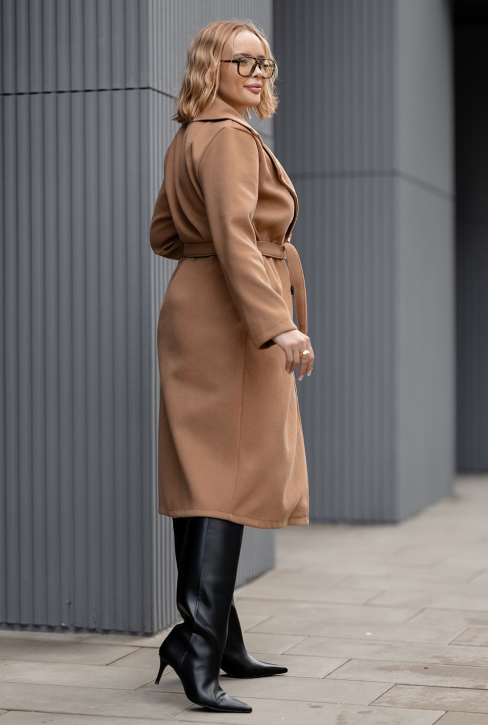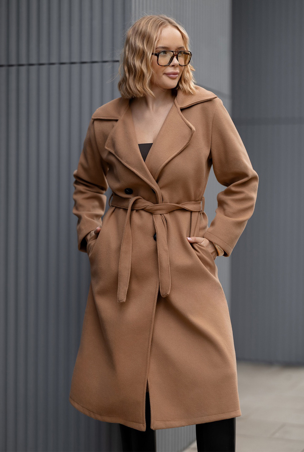 Płaszcz uszyty z miękkiego, przyjemnego w dotyku materiału. Model o wydłużonym fasonie z kołnierzem, zapinany z przodu na guziki i wyposażony w praktyczne kieszenie. Całość uzupełnia materiałowy pasek, który dołączono do kompletu. Dostępny w kilku wersjach kolorystycznych.