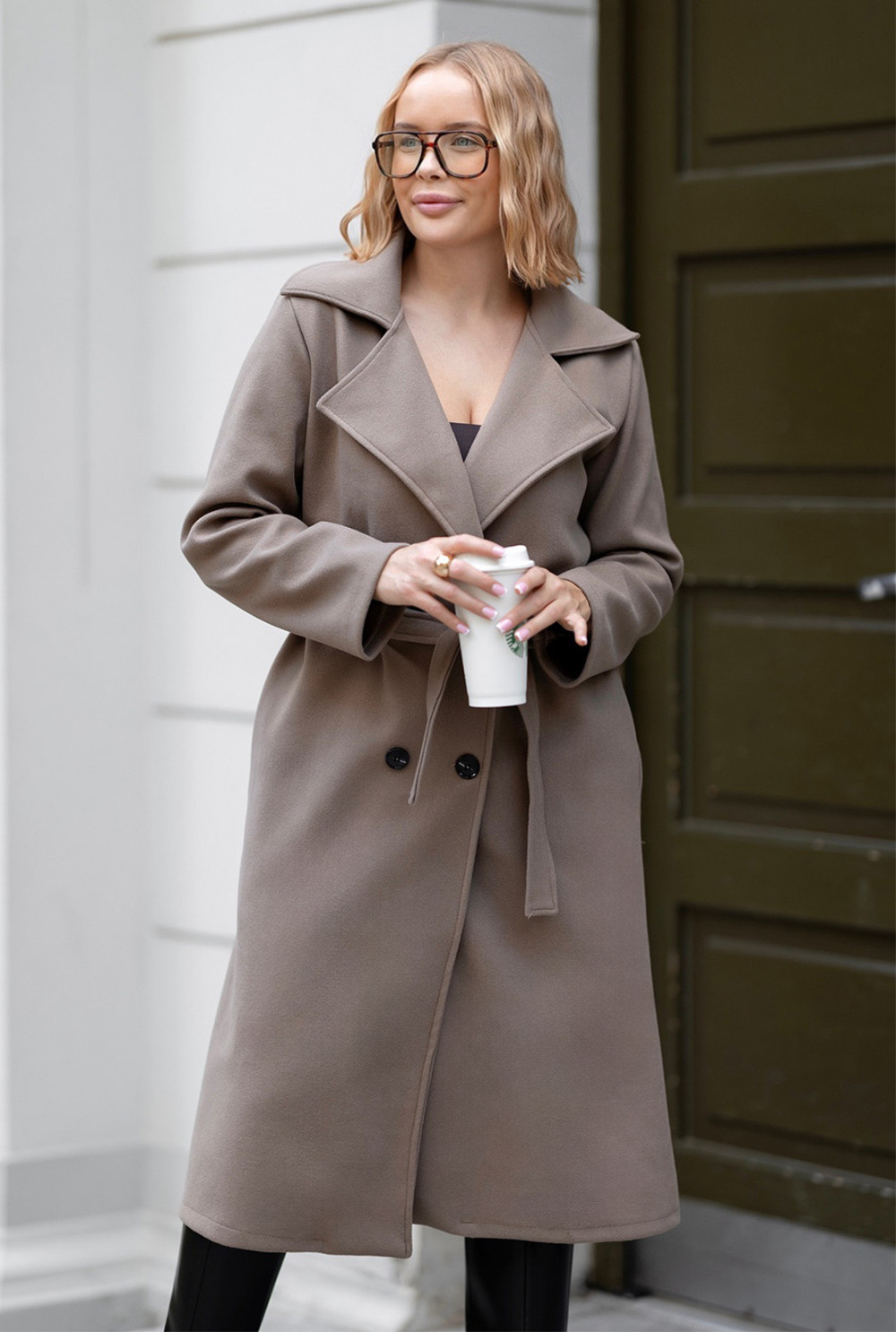 Płaszcz uszyty z miękkiego, przyjemnego w dotyku materiału. Model o wydłużonym fasonie z kołnierzem, zapinany z przodu na guziki i wyposażony w praktyczne kieszenie. Całość uzupełnia materiałowy pasek, który dołączono do kompletu. Dostępny w kilku wersjach kolorystycznych.