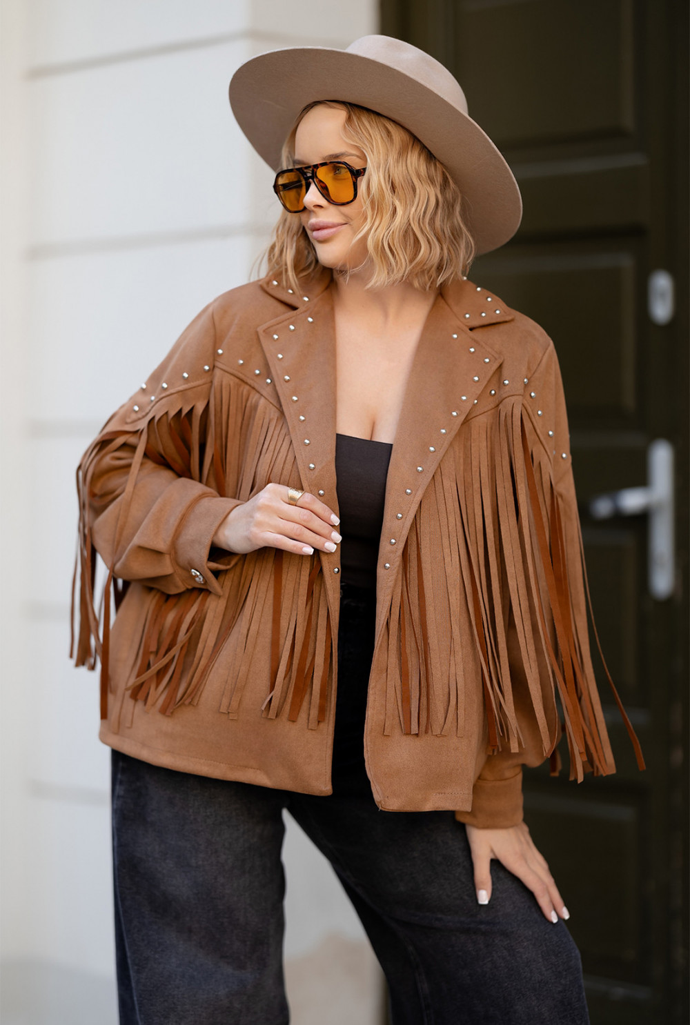 Lekka kurtka z miękkiej imitacji zamszu to idealne uzupełnienie stylizacji z nutą charakteru. Jej wyjątkowość podkreślają liczne ozdobne frędzle. Model o krótkim fasonie, bez zapięcia, z kołnierzykiem i długimi rękawami.