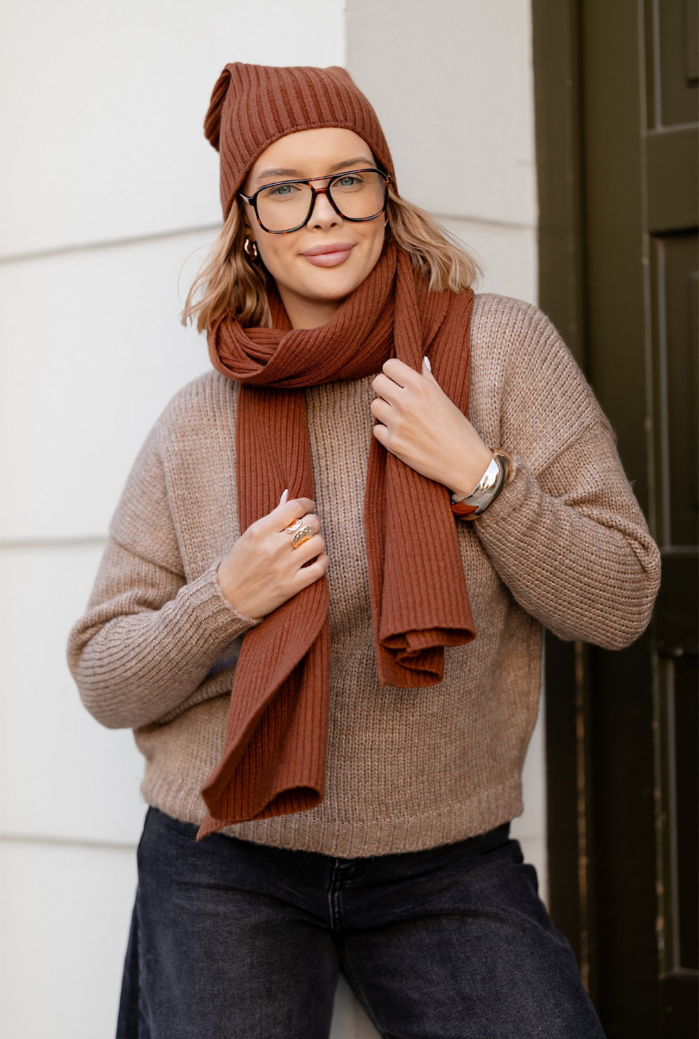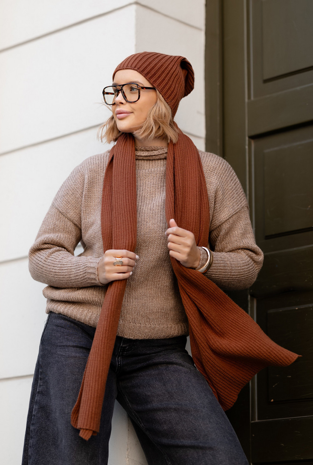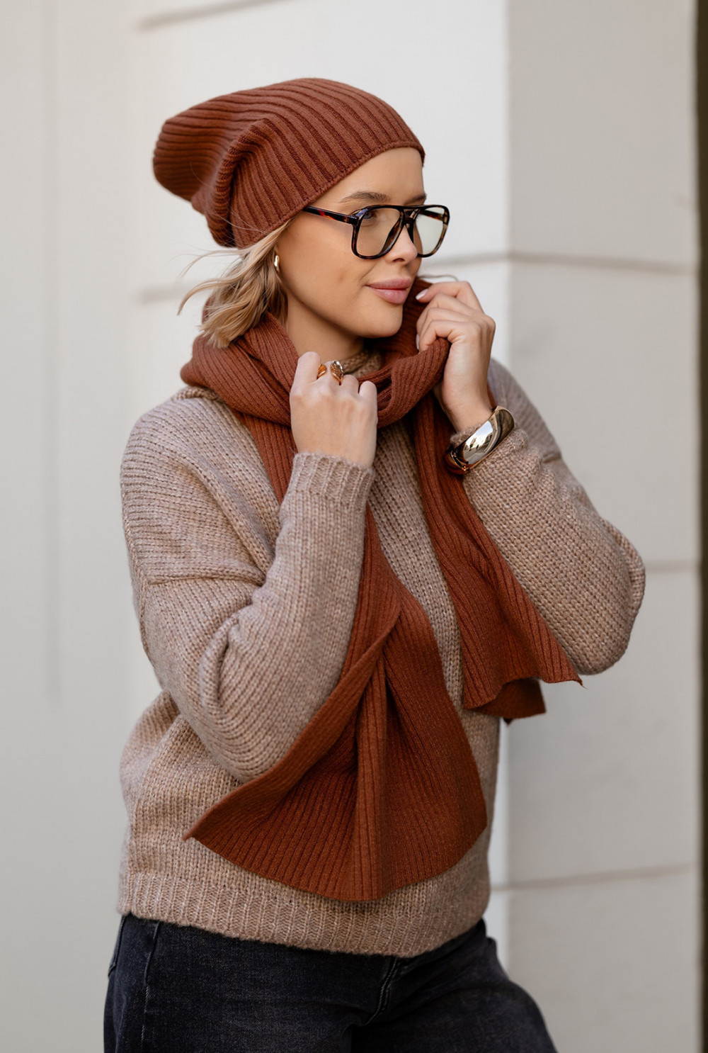 Miękki komplet idealny na chłodniejsze dni to propozycja, która sprawdzi się w każdej garderobie. Czapka połączona z długim szalem, stanowi świetne uzupełnienie codziennych looków. Ten zestaw dostępny jest w kilku wariantach kolorystycznych.
