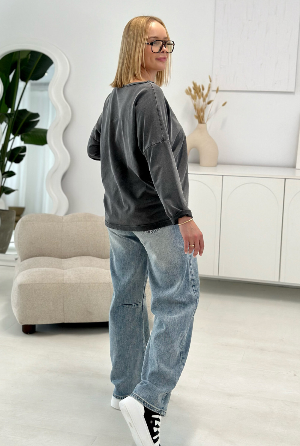 Bawełniana bluzka z subtelnym nadrukiem to idealny wybór do codziennych stylizacji. To model o oversizowym fasonie z długimi rękawami i zaokrąglonym dekoltem.