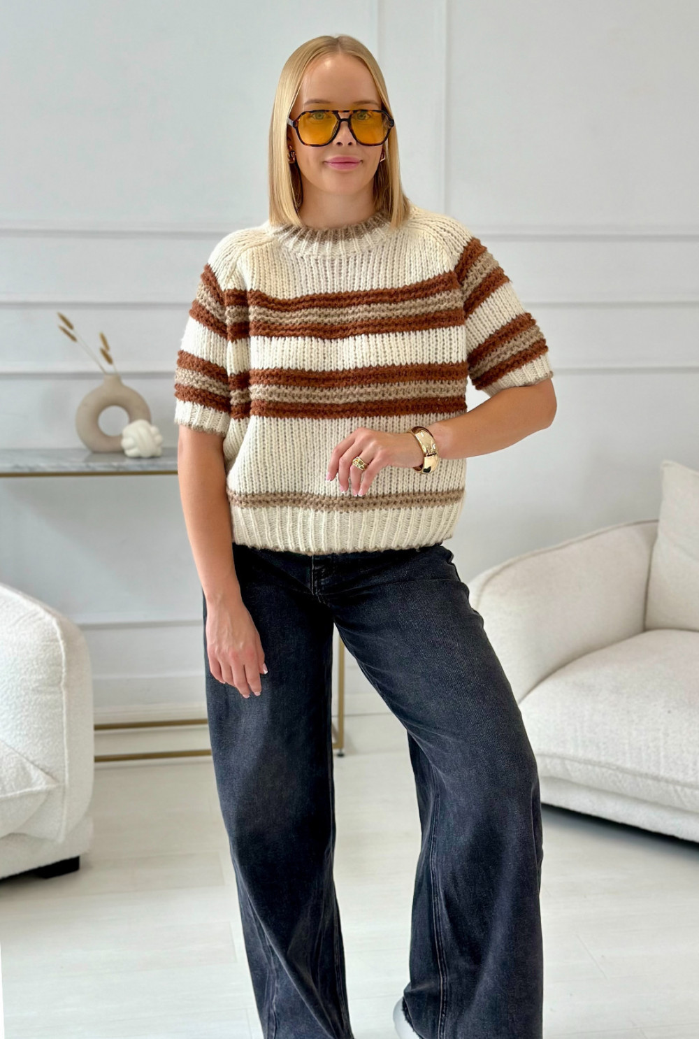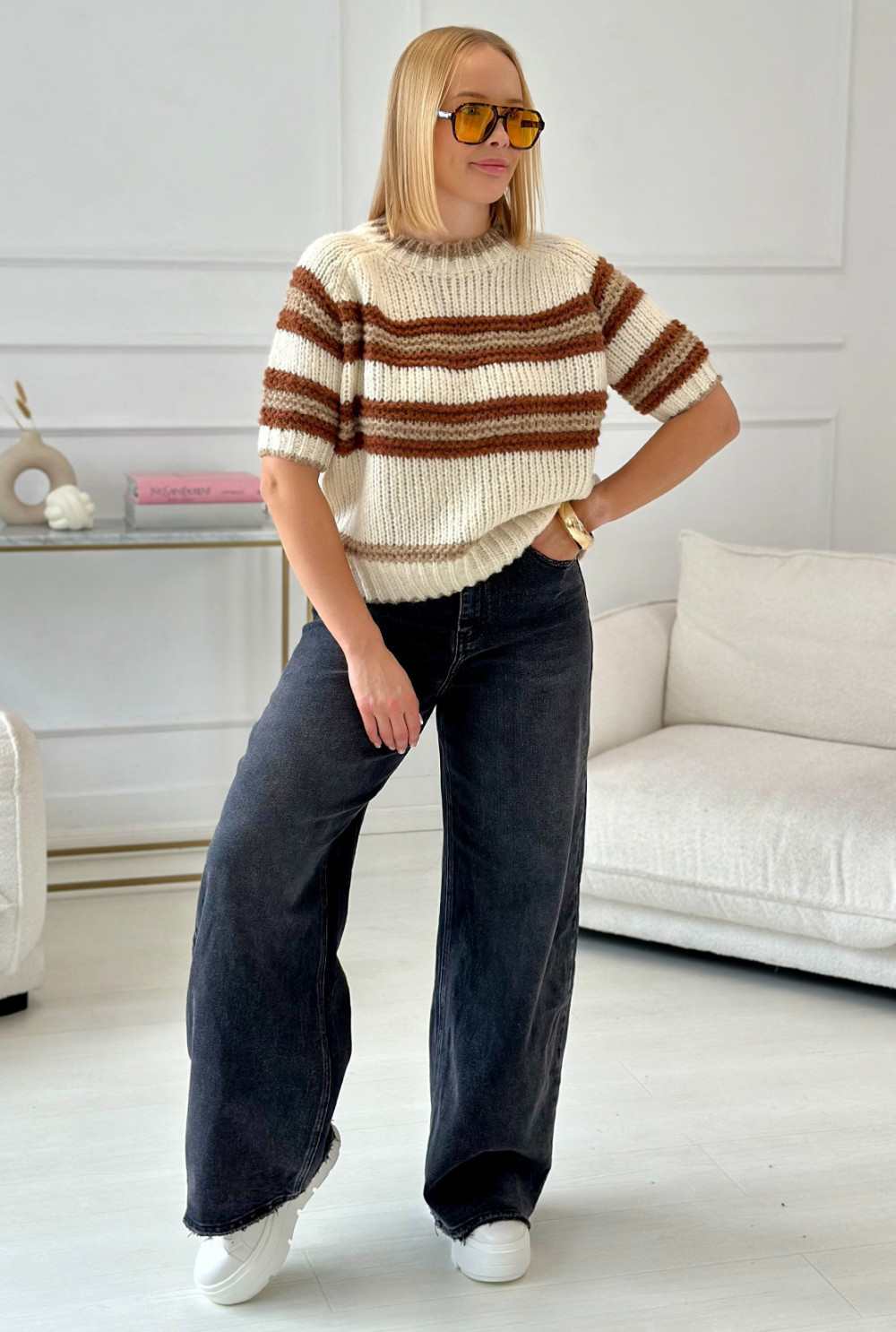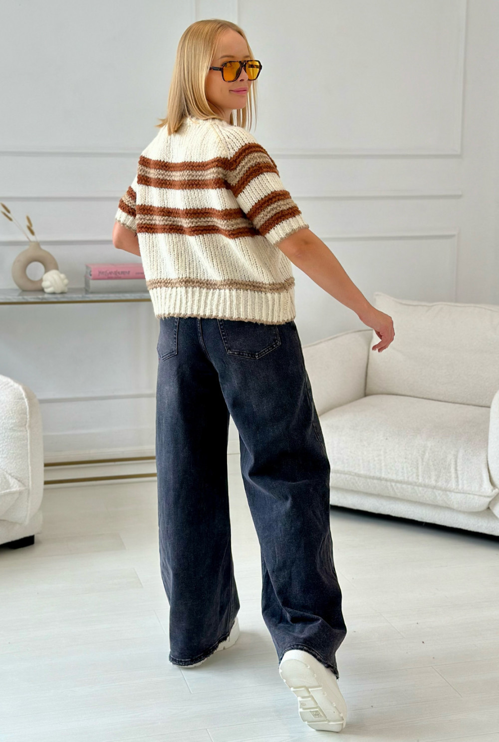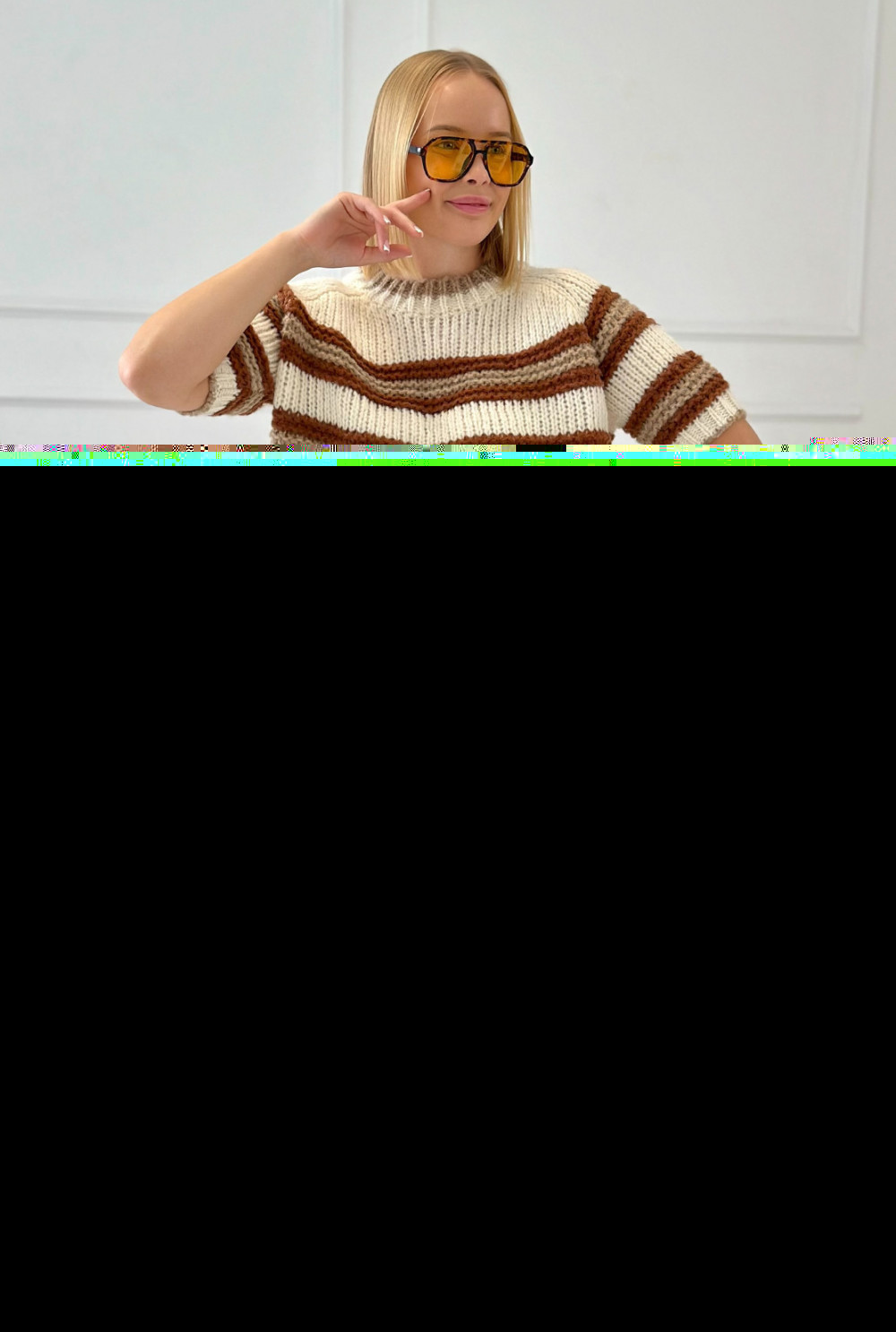 Miękki sweterek to idealny wybór na chłodniejsze dni - stylowy, wygodny i niezwykle przyjemny w dotyku. Ma lekko oversizowy krój oraz krótkie rękawy zakończone ściągaczami, podobnie jak dół swetra. Ten model doskonale wpisze się w codzienne, komfortowe stylizacje.