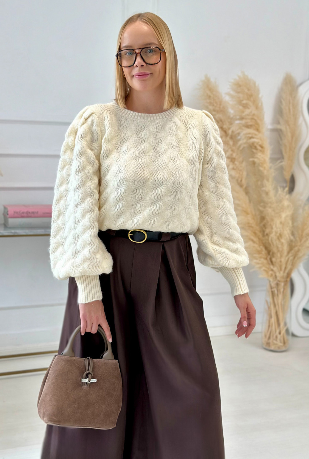 Piękny sweter z ozdobnym splotem to doskonały wybór na chłodniejsze dni. Wyróżnia się oryginalnymi rękawami, które nadają całości charakteru. Pięknie zaprezentuje się zarówno w eleganckich, jak i sportowych stylizacjach.