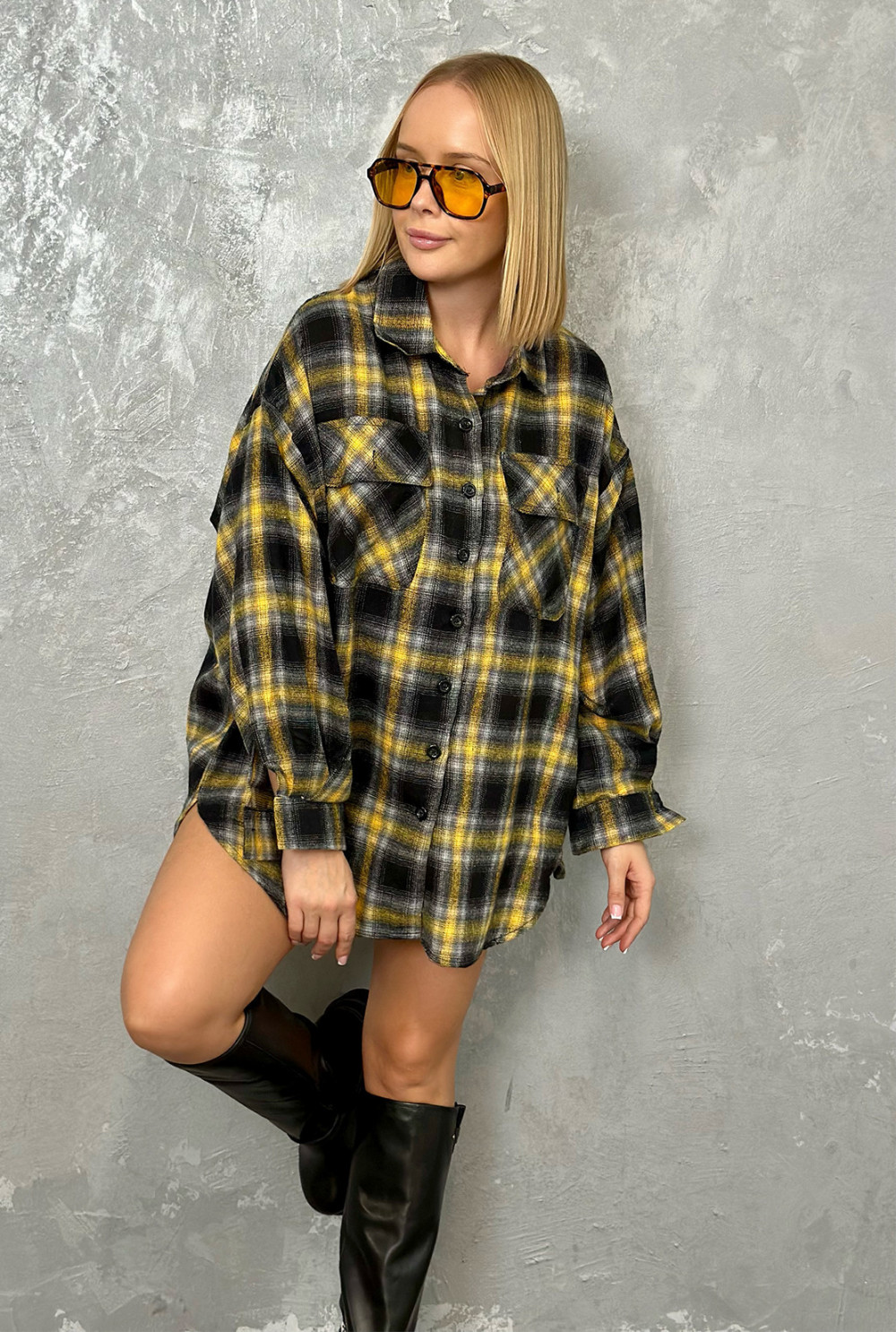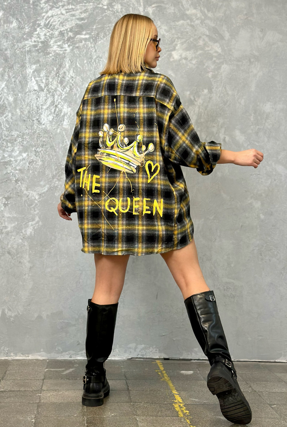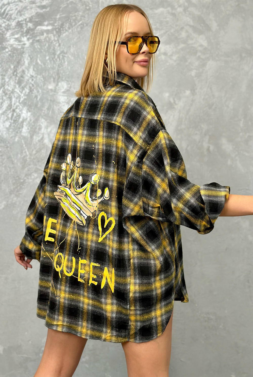 Koszula w kratę wyróżniająca się nadrukiem na plecach. To propozycja o oversizowym, asymetrycznym kroju. Model zapinany na rząd guzików. Na wysokości biustu znajdują się funkcjonalne kieszonki.