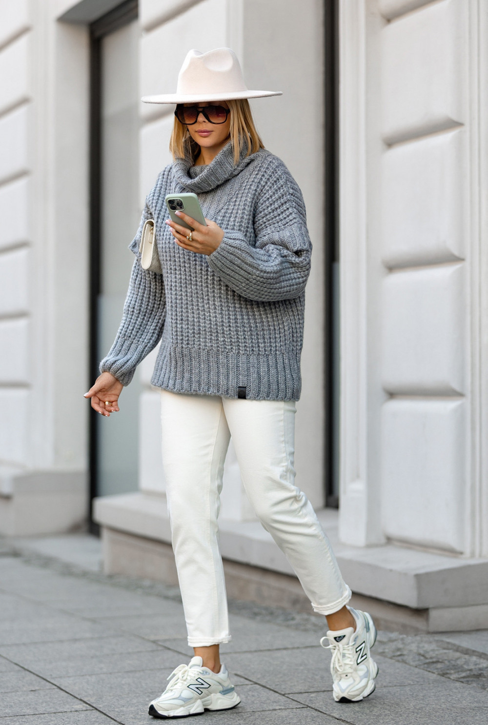 Stylowy sweter o luźnym kroju wykonany z miękkiej, przyjemnej w dotyku przędzy. Model wyróżnia się ozdobnym splotem oraz wysokim golfem, który zapewnia ciepło i komfort w chłodniejsze dni. Subtelne falbanki na rękawach dodają mu kobiecego uroku i delikatności. Rękawy wykończone są ściągaczami. Doskonały wybór do codziennych stylizacji.