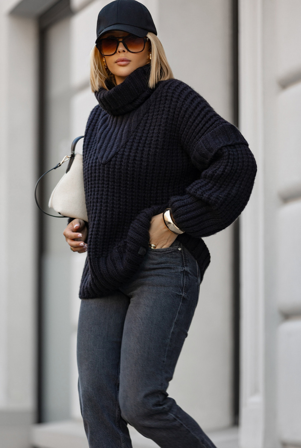 Stylowy sweter o luźnym kroju wykonany z miękkiej, przyjemnej w dotyku przędzy. Model wyróżnia się ozdobnym splotem oraz wysokim golfem, który zapewnia ciepło i komfort w chłodniejsze dni. Subtelne falbanki na rękawach dodają mu kobiecego uroku i delikatności. Rękawy wykończone są ściągaczami. Doskonały wybór do codziennych stylizacji.