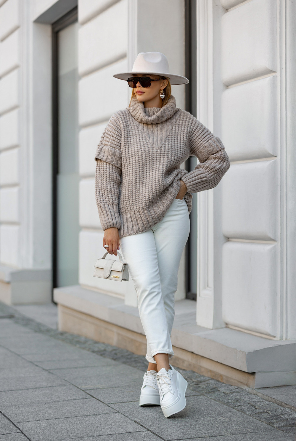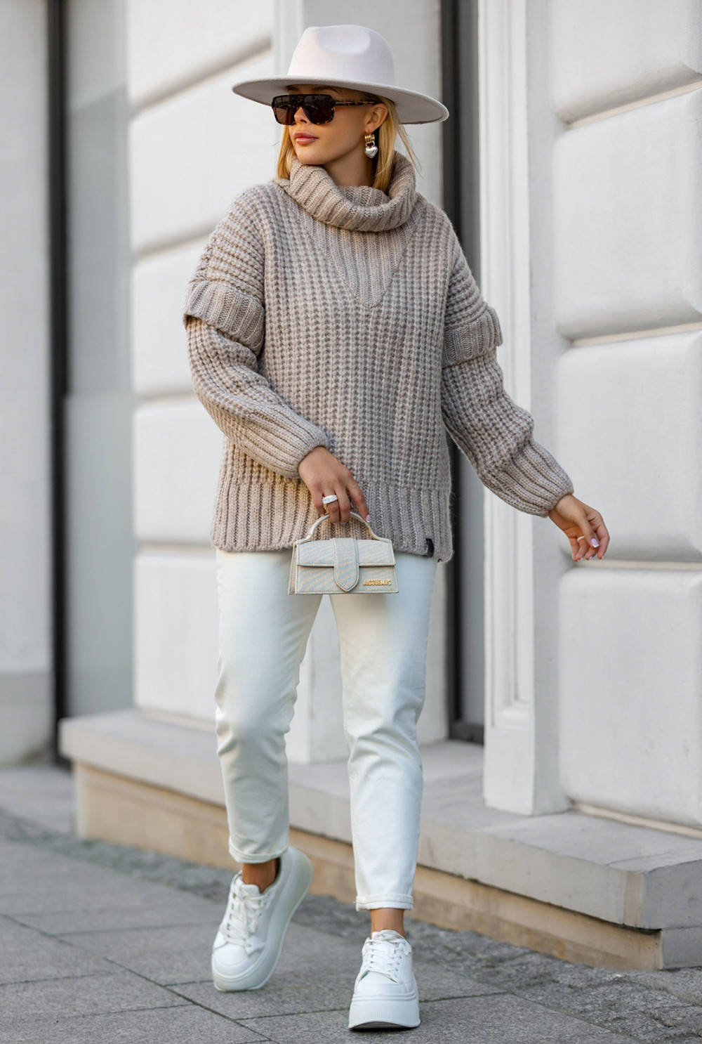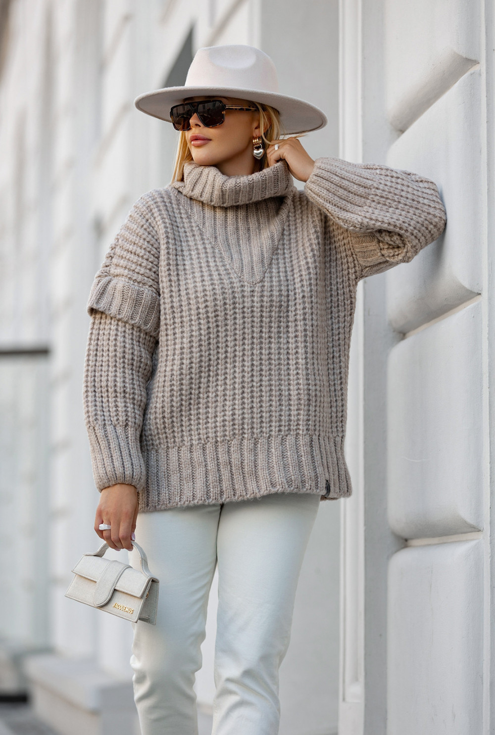Stylowy sweter o luźnym kroju wykonany z miękkiej, przyjemnej w dotyku przędzy. Model wyróżnia się ozdobnym splotem oraz wysokim golfem, który zapewnia ciepło i komfort w chłodniejsze dni. Subtelne falbanki na rękawach dodają mu kobiecego uroku i delikatności. Rękawy wykończone są ściągaczami. Doskonały wybór do codziennych stylizacji.