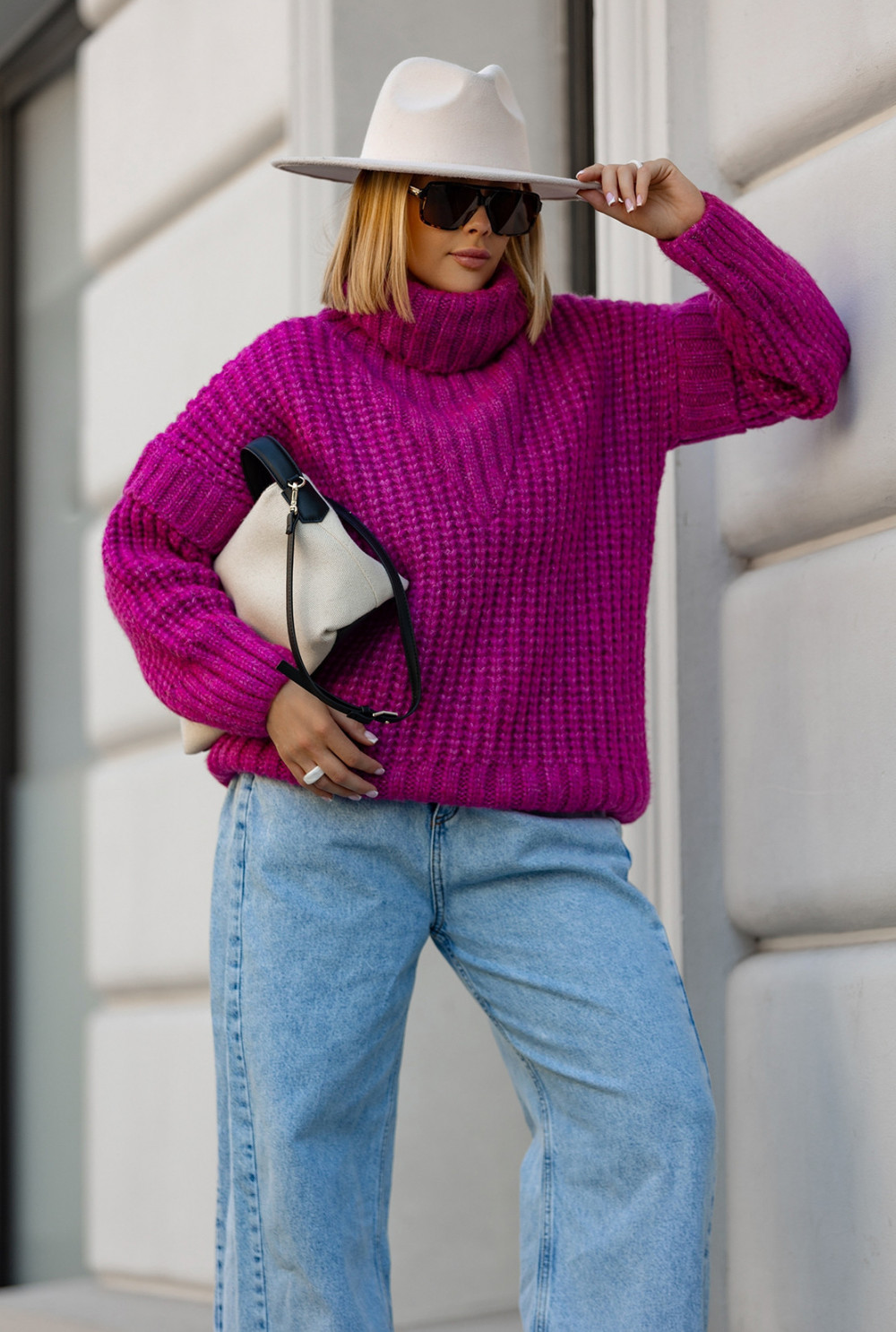 Stylowy sweter o luźnym kroju wykonany z miękkiej, przyjemnej w dotyku przędzy. Model wyróżnia się ozdobnym splotem oraz wysokim golfem, który zapewnia ciepło i komfort w chłodniejsze dni. Subtelne falbanki na rękawach dodają mu kobiecego uroku i delikatności. Rękawy wykończone są ściągaczami. Doskonały wybór do codziennych stylizacji.
