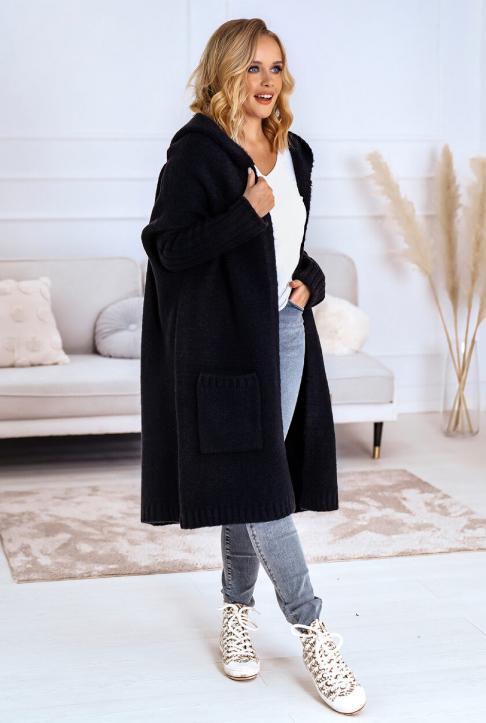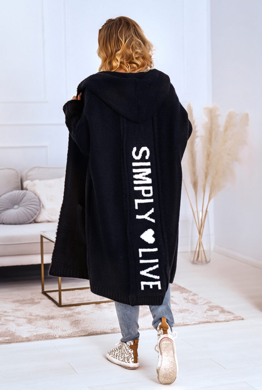 Przyjemny w dotyku kardigan o oversizowym kroju. Oryginalny napis na plecach. Model posiada dwie naszyte kieszenie i obszerny kaptur. Zakończony długimi ściągaczami.