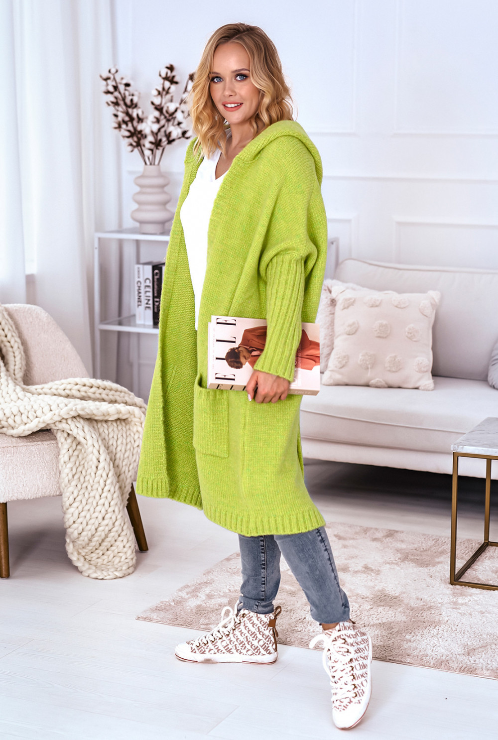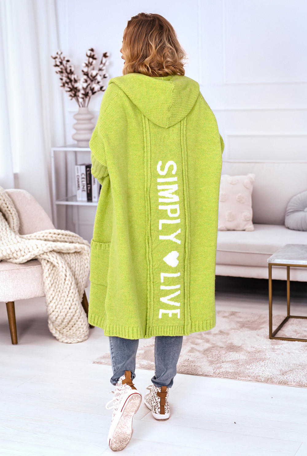 Przyjemny w dotyku kardigan o oversizowym kroju. Oryginalny napis na plecach. Model posiada dwie naszyte kieszenie i obszerny kaptur. Zakończony długimi ściągaczami.