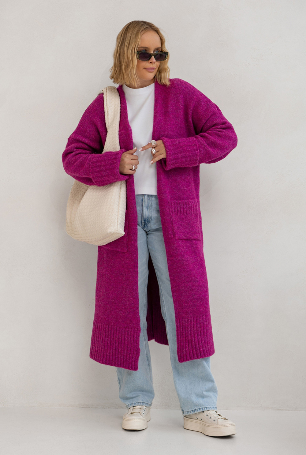 Długi kardigan o luźnym, oversizowym kroju to absolutny must have w kobiecej garderobie! Zwraca uwagę subtelnym splotem, praktycznymi kieszeniami i wywijanymi rękawami. To idealna propozycja do codziennych, komfortowych stylizacji, które łączą styl z wygodą.