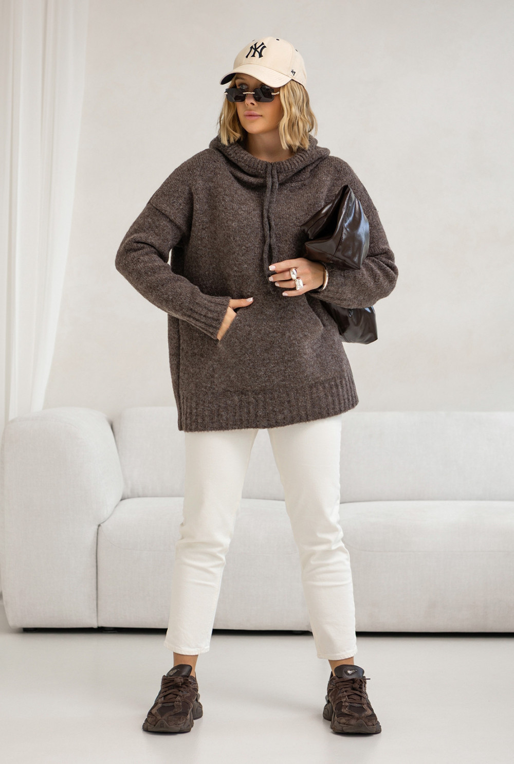 Sweter oversize z kapturem Kangurka Ciemne Kakao