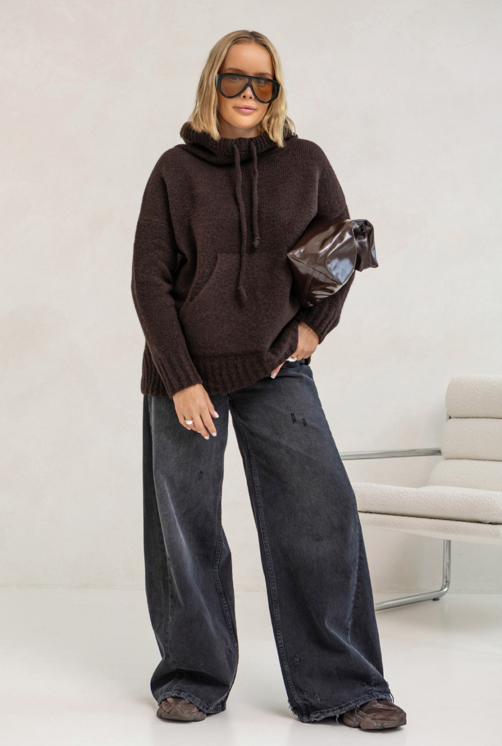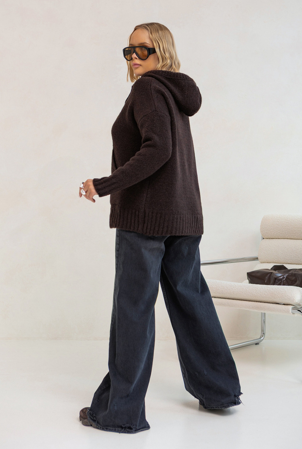 Luźny sweter z miękkiej, przyjemnej w dotyku dzianiny. Posiada kaptur ze ściągaczem, obszerną kieszeń z przodu oraz rękawy zakończone ściągaczami. Dostępny w kilku wariantach kolorystycznych.
