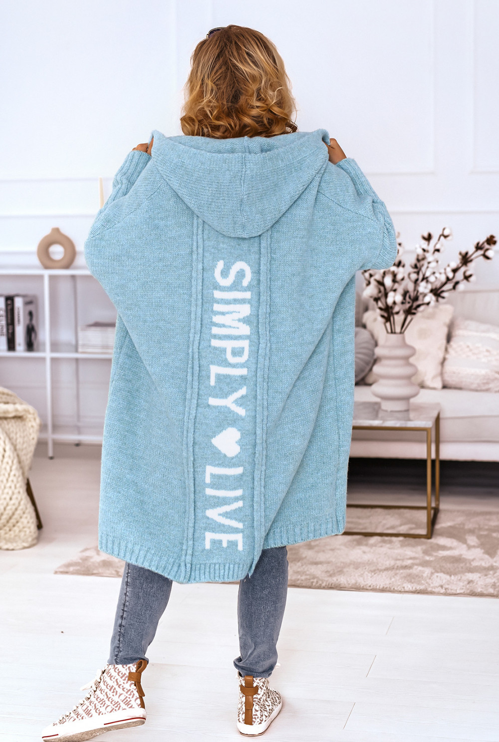 Przyjemny w dotyku kardigan o oversizowym kroju. Oryginalny napis na plecach. Model posiada dwie naszyte kieszenie i obszerny kaptur. Zakończony długimi ściągaczami.