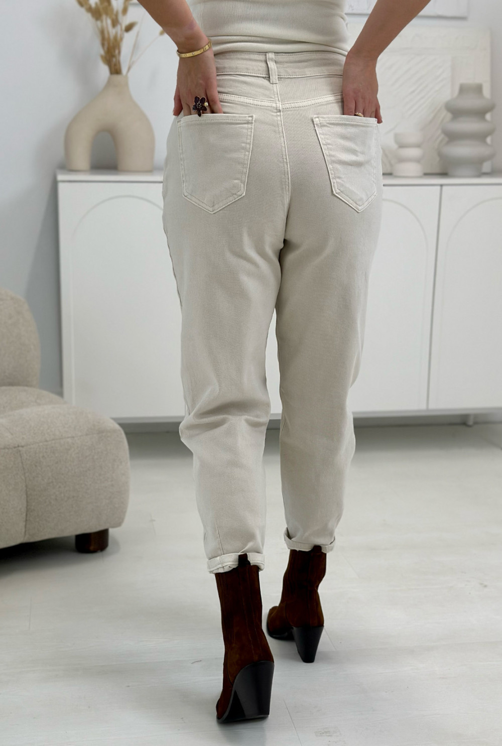Jeansy o kroju mom fit, z wysokim stanem, uszyte z elastycznej tkaniny, która zapewnia komfort i swobodę noszenia. Zapinany jest na suwak oraz guzik. Zarówno z przodu, jak i z tyłu znajdują się funkcjonalne kieszenie.