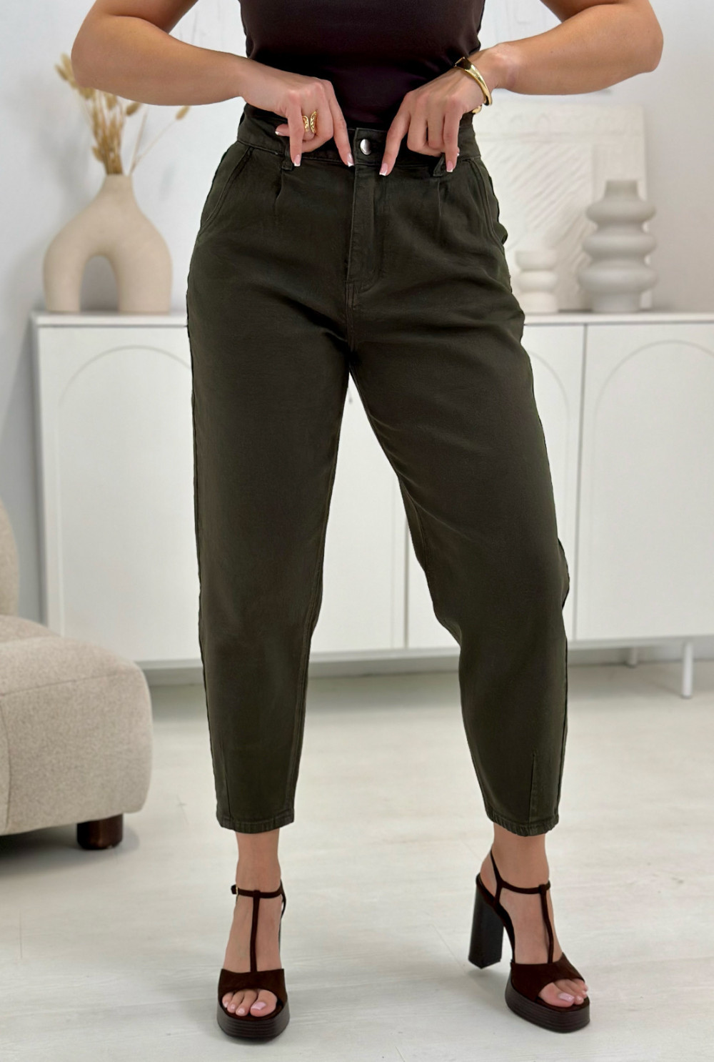 Jeansy o kroju mom fit, z wysokim stanem, uszyte z elastycznej tkaniny, która zapewnia komfort i swobodę noszenia. Zapinany jest na suwak oraz guzik. Zarówno z przodu, jak i z tyłu znajdują się funkcjonalne kieszenie.