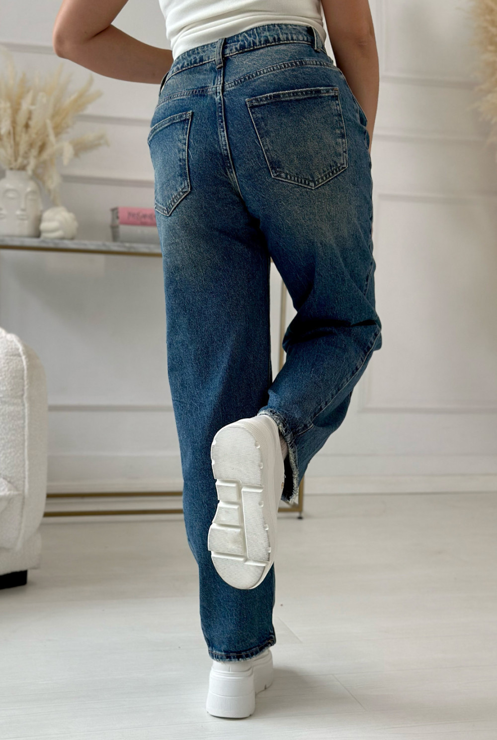 Jeansy o kroju baggy z luźnymi nogawkami, delikatnie zwężanymi ku dołowi. Wykonane z wysokiej jakości, nieelastycznego denimu w klasycznym, niebieskim odcieniu z subtelnymi przetarciami. Model posiada wysoki stan, zapinany na guzik i suwak. Zarówno z przodu, jak i z tyłu znajdują się funkcjonalne kieszenie. To wygodny i stylowy fason, który świetnie sprawdzi się w codziennych stylizacjach.