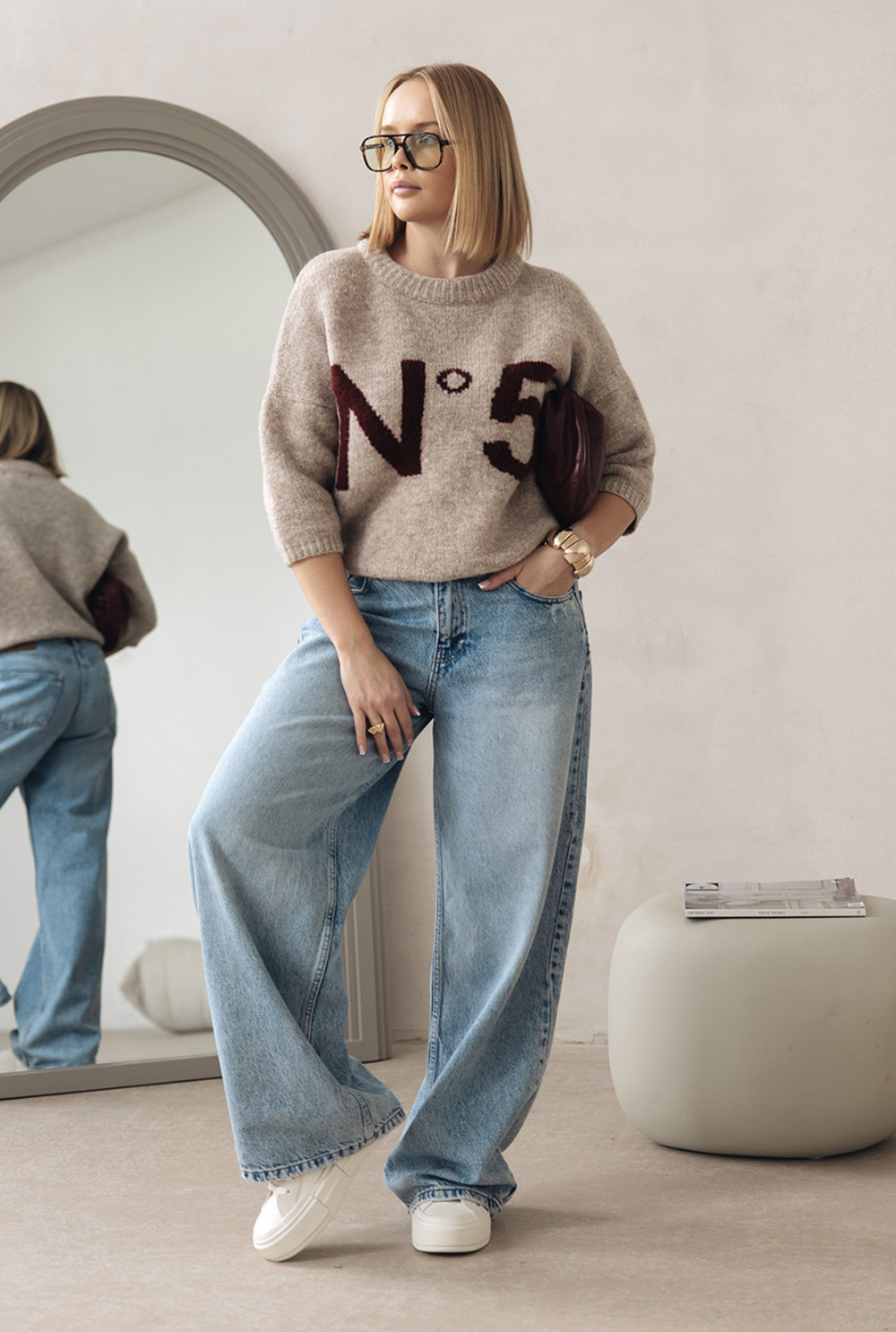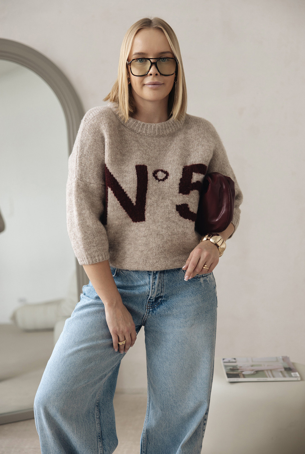 Stylowy sweter z miękkiej dzianiny, zakończony ściągaczami przy rękawach i na dole. Rękaw długości za łokieć nadaje mu nowoczesny charakter, a klasyczny napis N°5 dodaje francuskiego szyku. Dostępny w kilku wersjach kolorystycznych - idealny do jeansów i codziennych stylizacji.