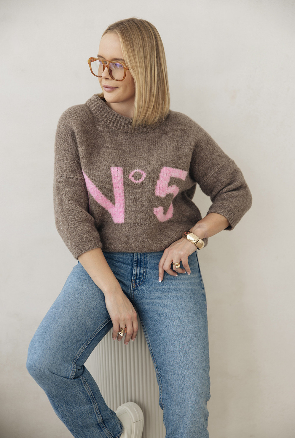 Stylowy sweter z miękkiej dzianiny, zakończony ściągaczami przy rękawach i na dole. Rękaw długości za łokieć nadaje mu nowoczesny charakter, a klasyczny napis N°5 dodaje francuskiego szyku. Dostępny w kilku wersjach kolorystycznych - idealny do jeansów i codziennych stylizacji.