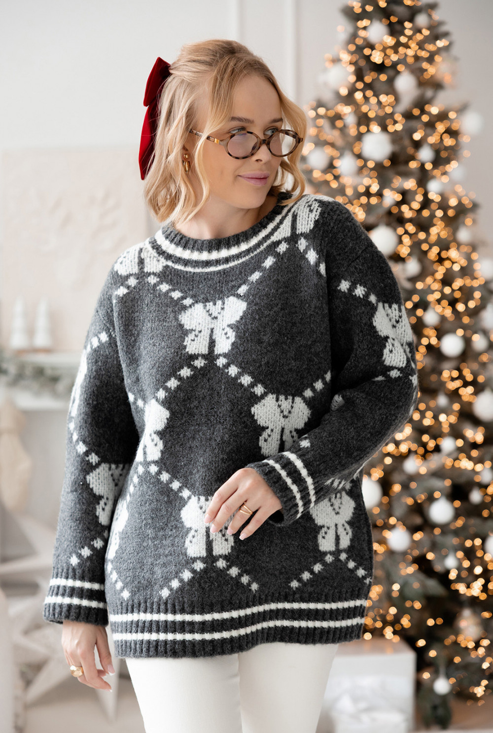 Świąteczny sweter w kokardy to idealny wybór na zimowy sezon! Miękki, ciepły i przyjemny w dotyku, z dodatkiem wełny. Luźniejszy krój zapewnia komfort noszenia, a wzór w kokardy dodaje uroku i świątecznego nastroju. Dostępny w kilku kolorach.