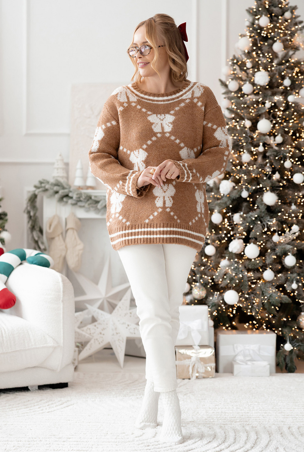Świąteczny sweter w kokardy to idealny wybór na zimowy sezon! Miękki, ciepły i przyjemny w dotyku, z dodatkiem wełny. Luźniejszy krój zapewnia komfort noszenia, a wzór w kokardy dodaje uroku i świątecznego nastroju. Dostępny w kilku kolorach.