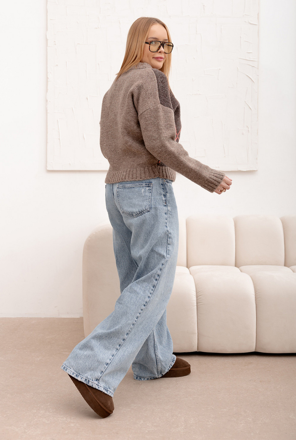 Miękki sweter w romby, niezwykle przyjemny w dotyku i idealny na chłodniejsze dni! Model posiada zaokrąglony dekolt, a jego efektowny wzór dodaje stylizacji wyjątkowego charakteru. Dół produktu, podobnie jak rękawy, został wykończony elastycznym ściągaczem, co zapewnia komfort noszenia i świetne dopasowanie.
