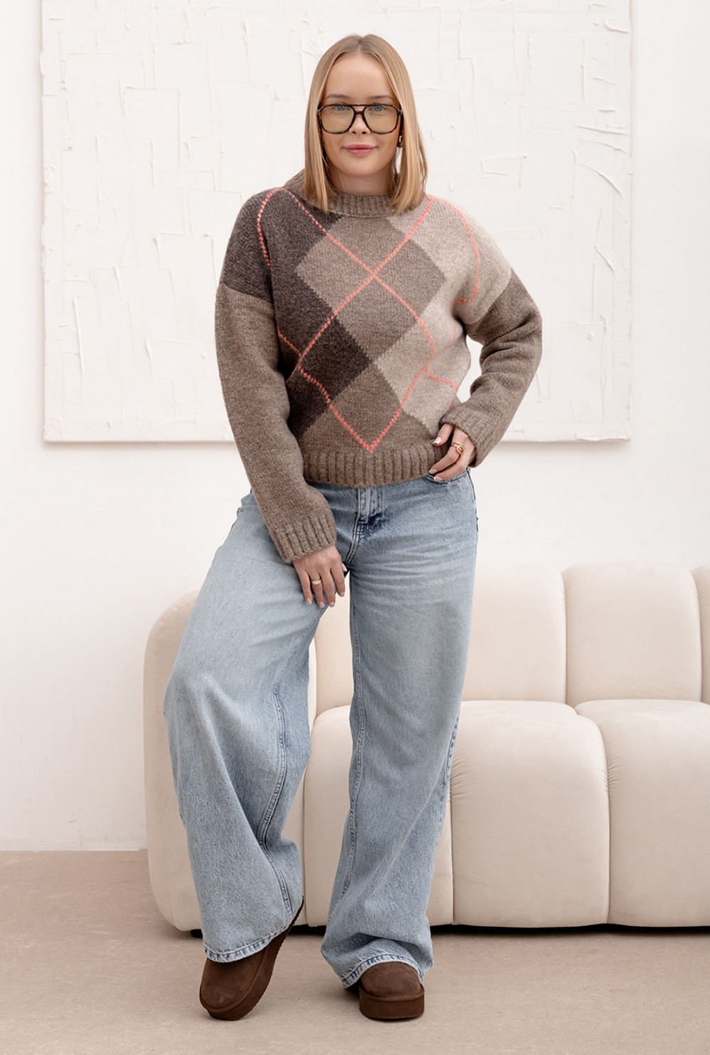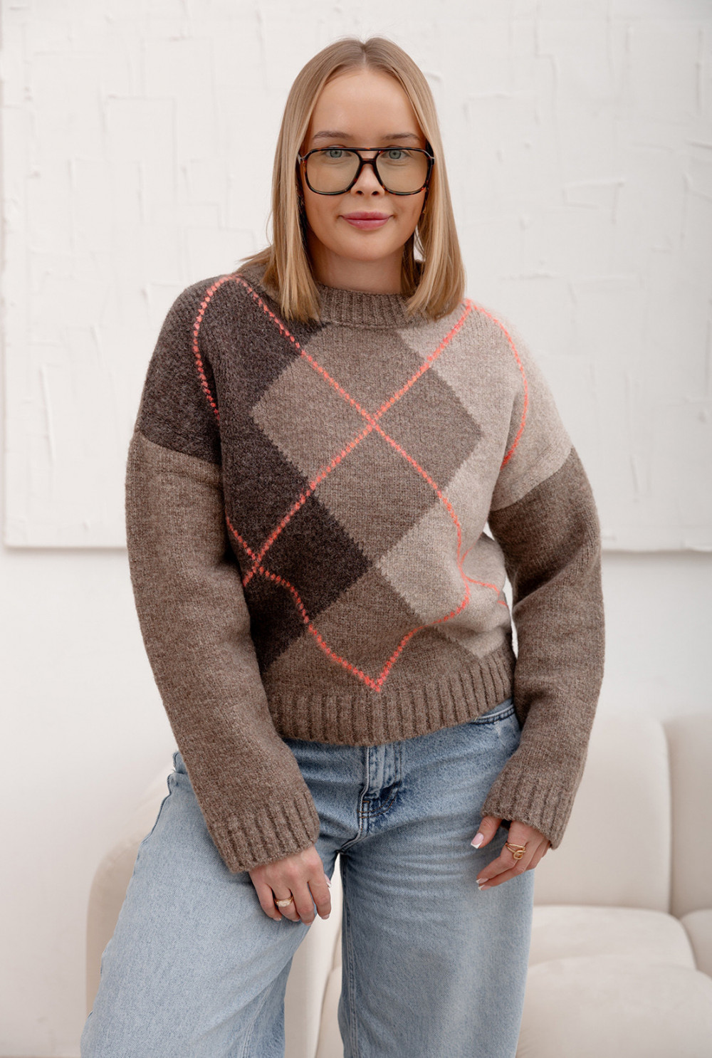 Sweter w romby z wełną Francisca Kakao-koral