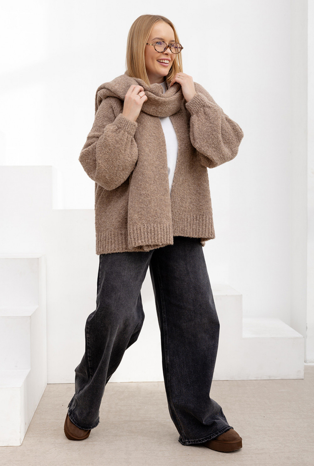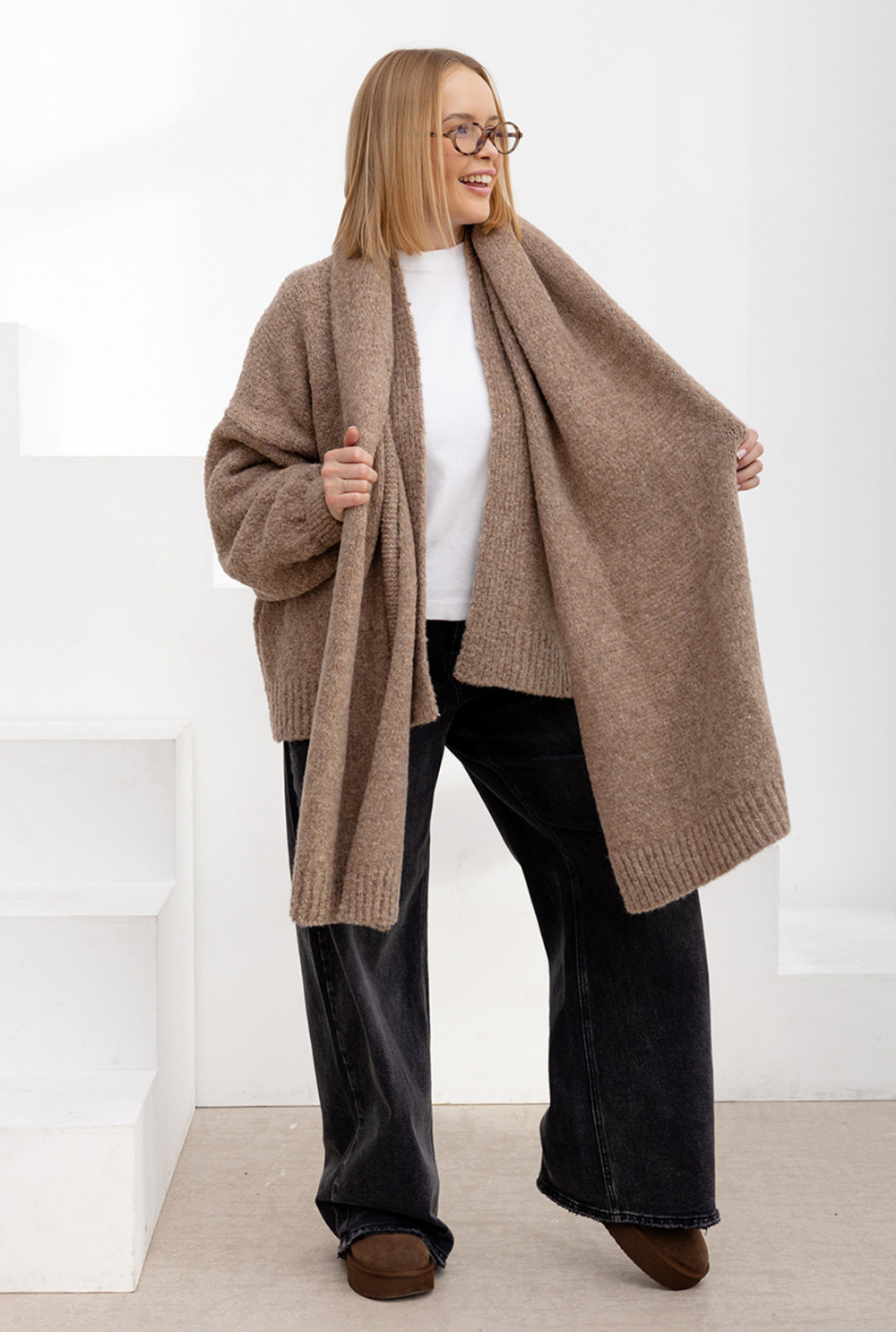 Miękki, ciepły kardigan oversize z dodatkiem wełny. Rękawy wykończone elastycznymi ściągaczami. W zestawie znajduje się szeroki szal w tym samym kolorze, tworzący spójną i elegancką stylizację. Idealny na chłodniejsze dni. Model dostępny w kilku kolorach!