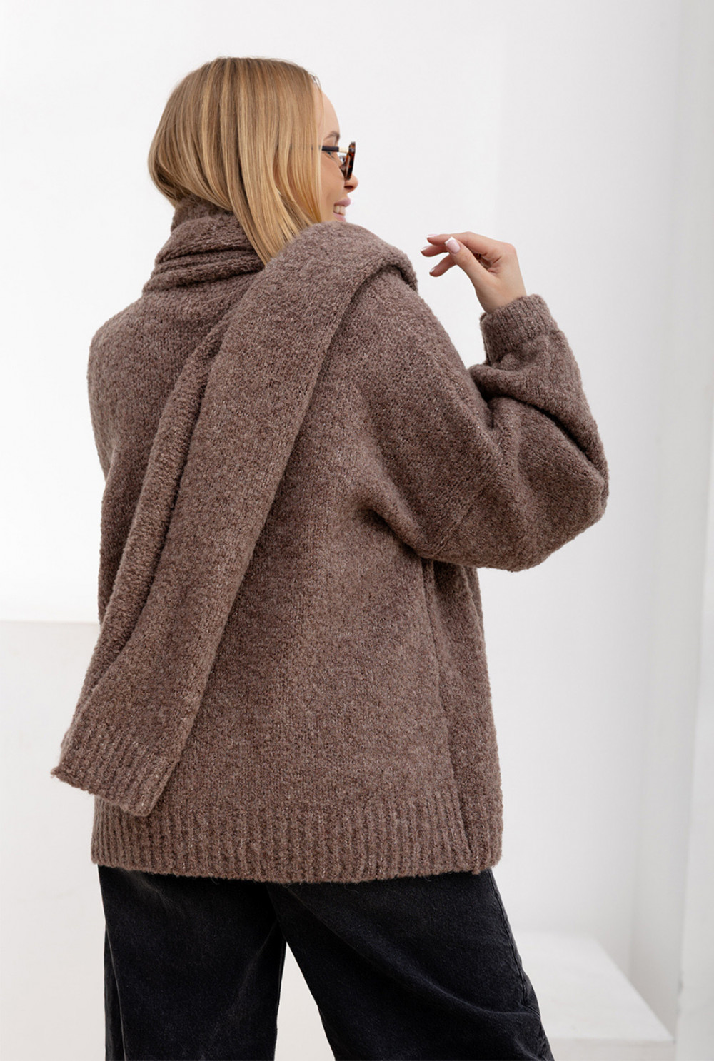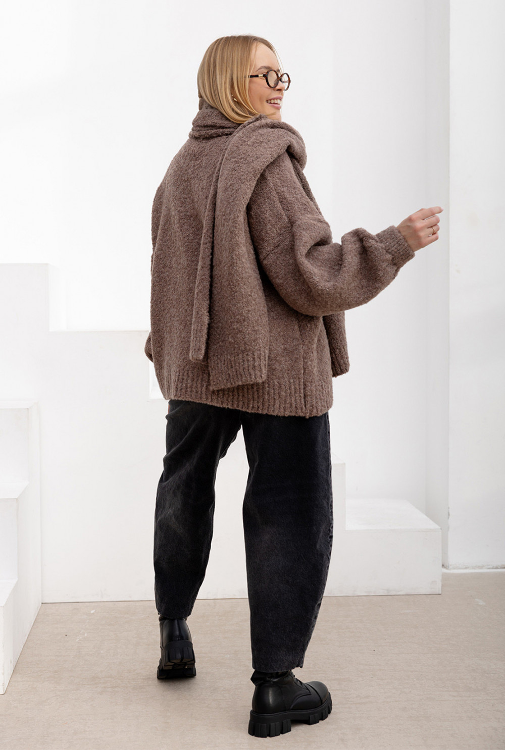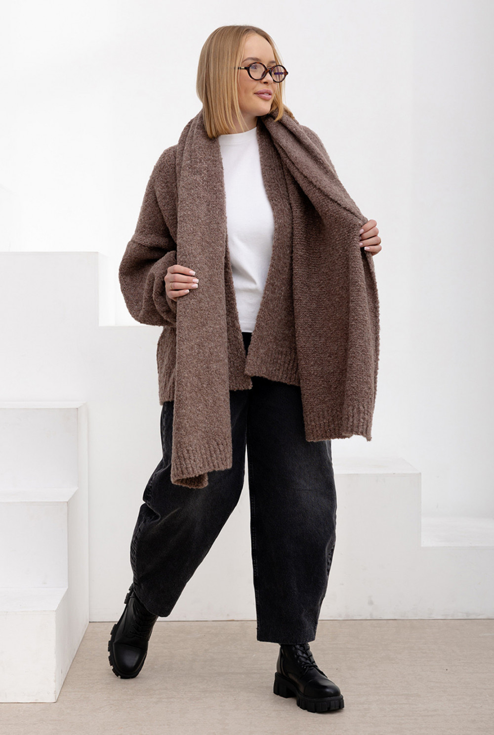 Miękki, ciepły kardigan oversize z dodatkiem wełny. Rękawy wykończone elastycznymi ściągaczami. W zestawie znajduje się szeroki szal w tym samym kolorze, tworzący spójną i elegancką stylizację. Idealny na chłodniejsze dni. Model dostępny w kilku kolorach!
