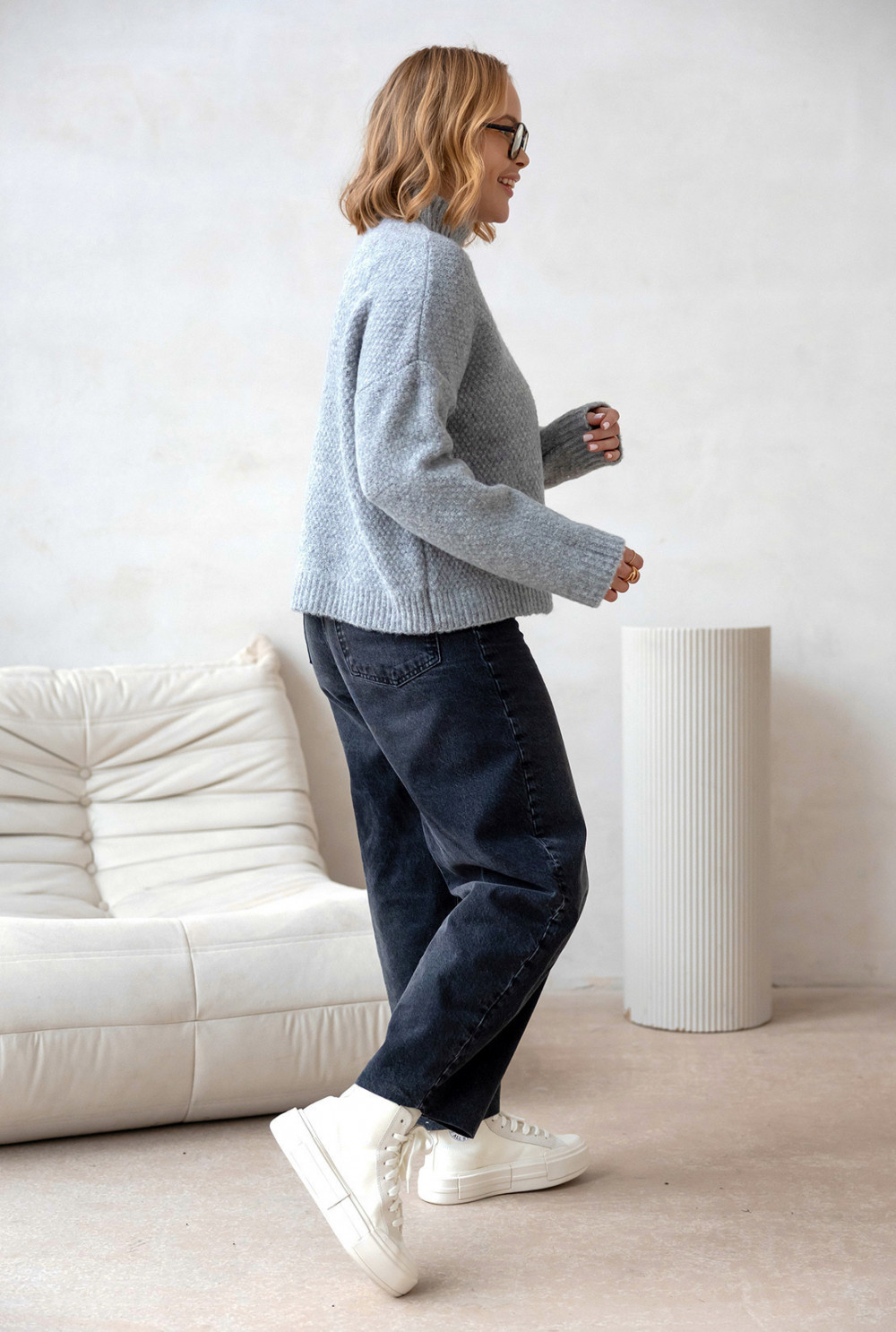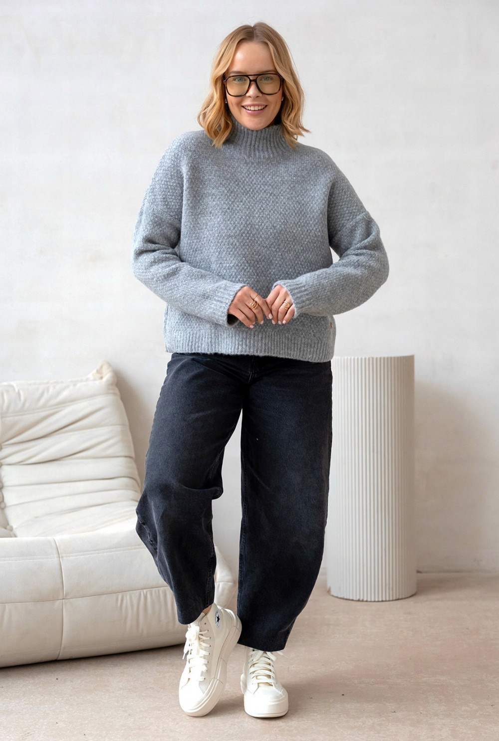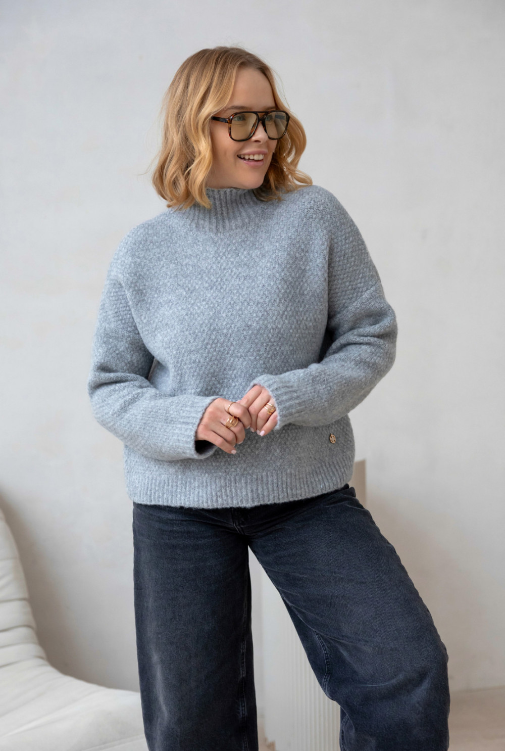 Miękki, ciepły sweter z golfem, idealny na chłodniejsze dni. Wykonany z dbałością o detale z wełna w składzie. Klasyczny, lekko oversizeowy krój dodaje mu nowoczesnego, a jednocześnie ponadczasowego charakteru. Dostępny w kilku wariantach kolorystycznych.