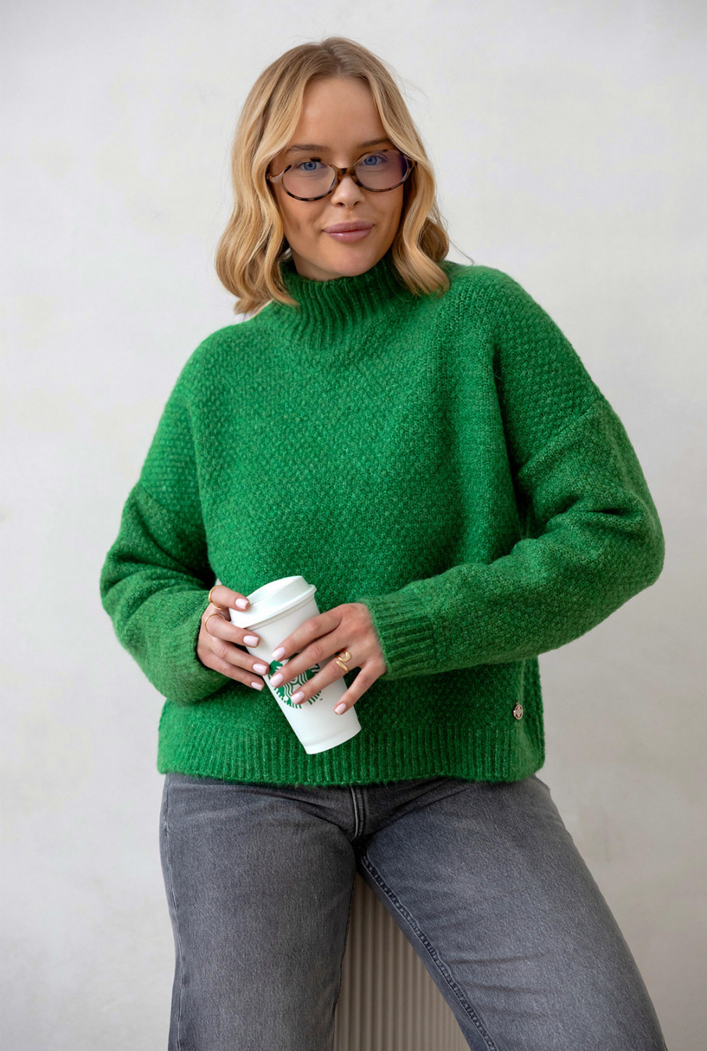 Miękki, ciepły sweter z golfem, idealny na chłodniejsze dni. Wykonany z dbałością o detale z wełna w składzie. Klasyczny, lekko oversizeowy krój dodaje mu nowoczesnego, a jednocześnie ponadczasowego charakteru. Dostępny w kilku wariantach kolorystycznych.