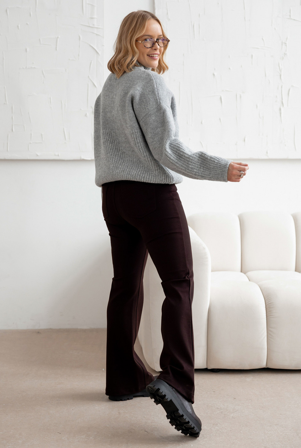 Miękki, przyjemny w dotyku sweterek z dodatkiem wełny. Model o lekko skróconym kroju i delikatnie zaokrąglonym dekolcie pięknie układa się na sylwetce. Charakteru dodają mu szersze rękawy zakończone ściągaczami, takimi samymi jak dół swetra.
