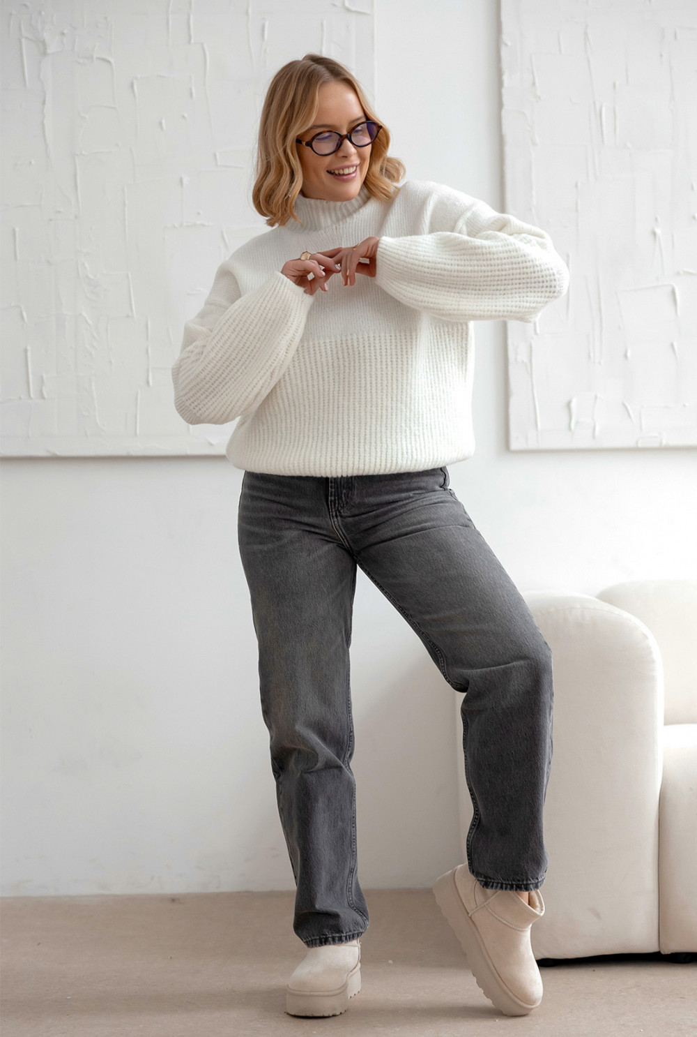 Miękki, przyjemny w dotyku sweterek z dodatkiem wełny. Model o lekko skróconym kroju i delikatnie zaokrąglonym dekolcie pięknie układa się na sylwetce. Charakteru dodają mu szersze rękawy zakończone ściągaczami, takimi samymi jak dół swetra.