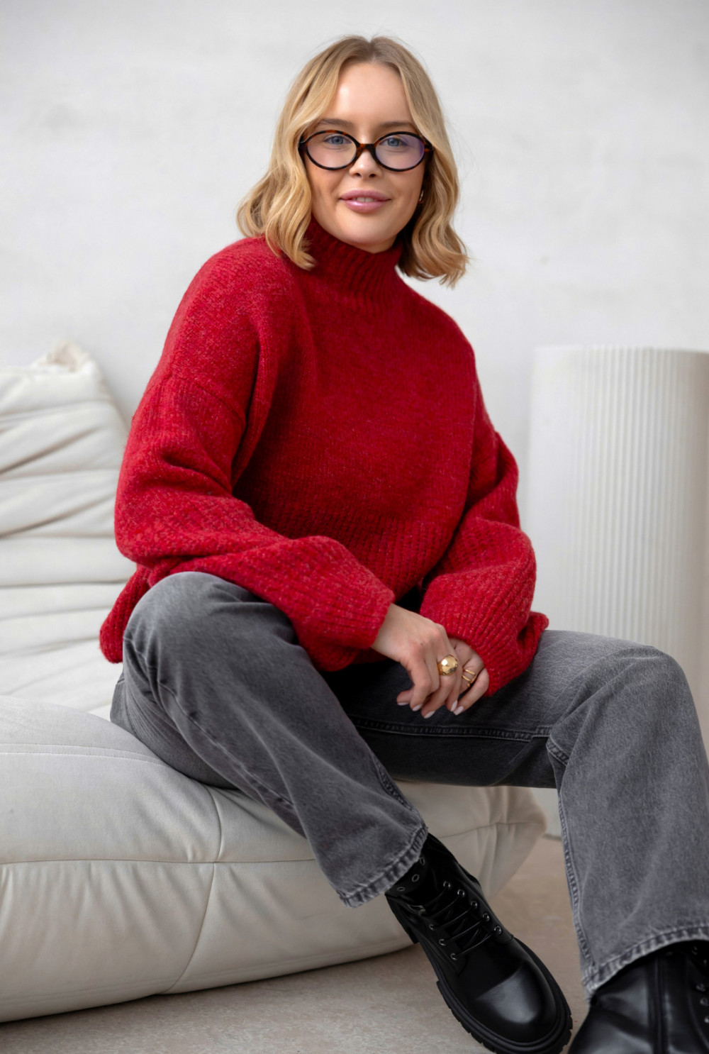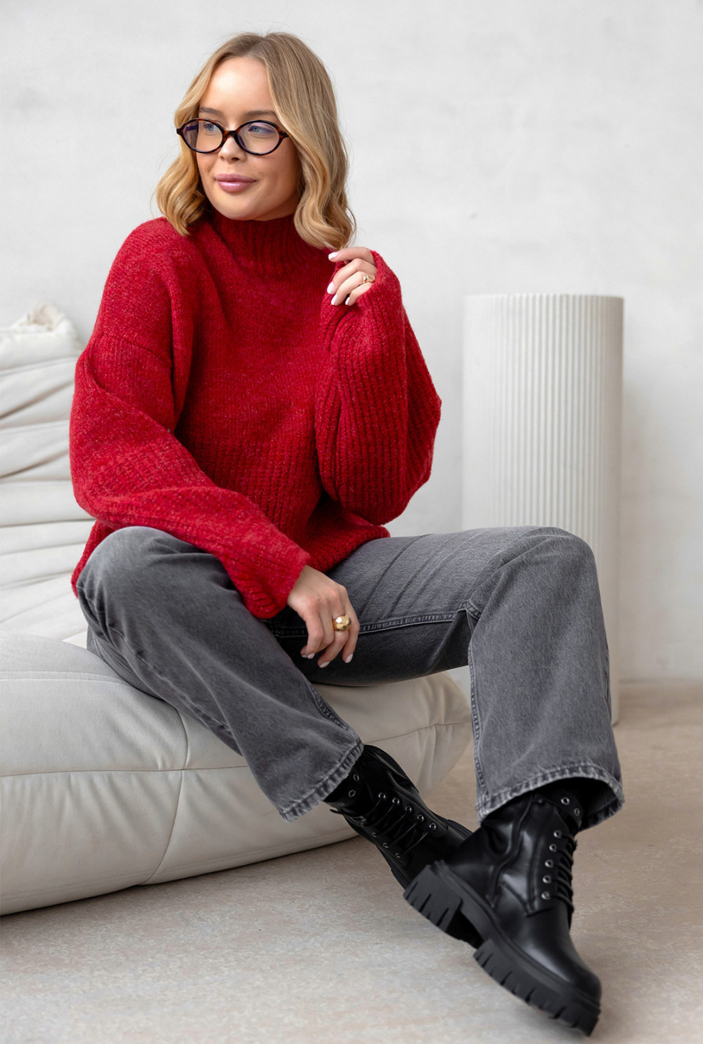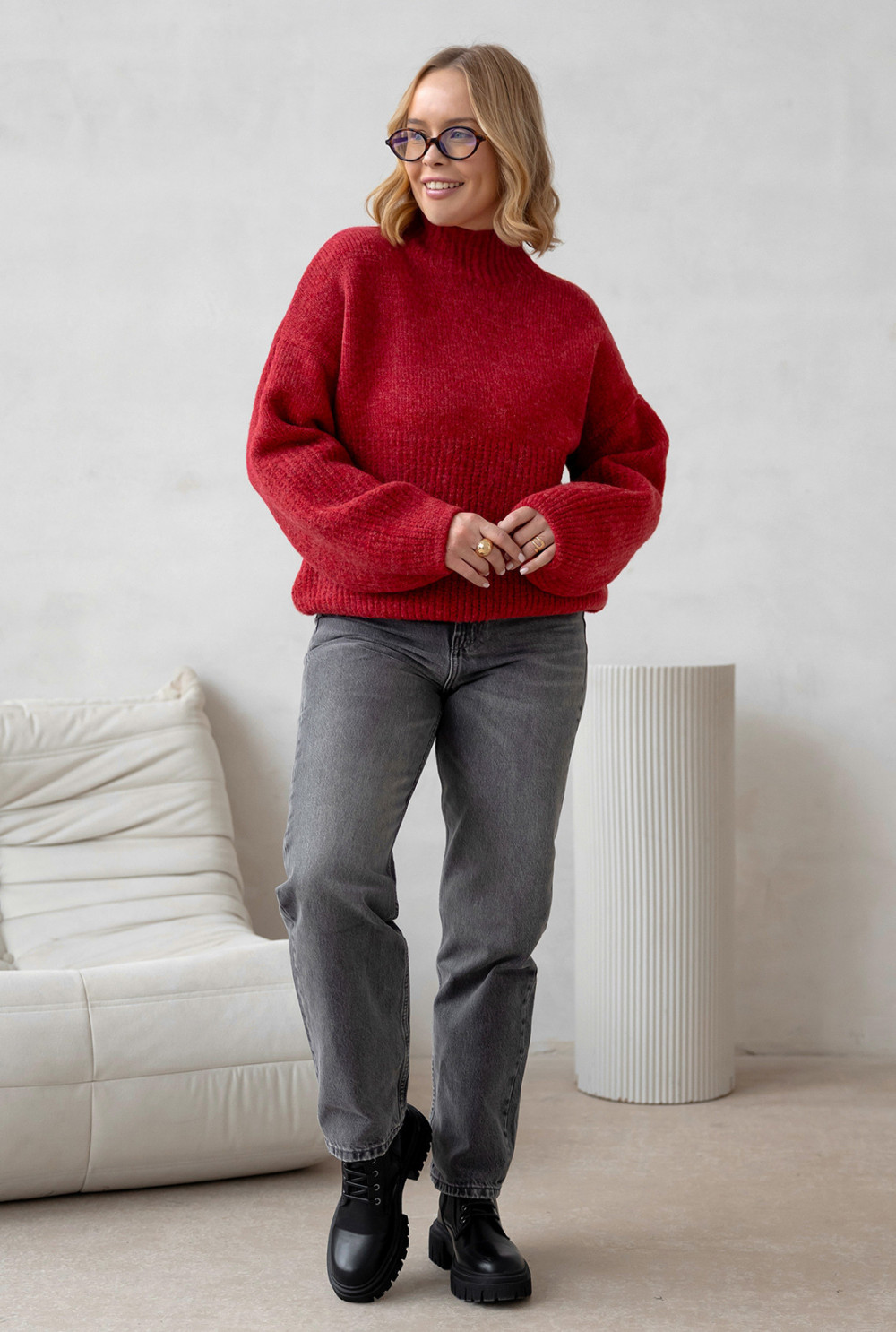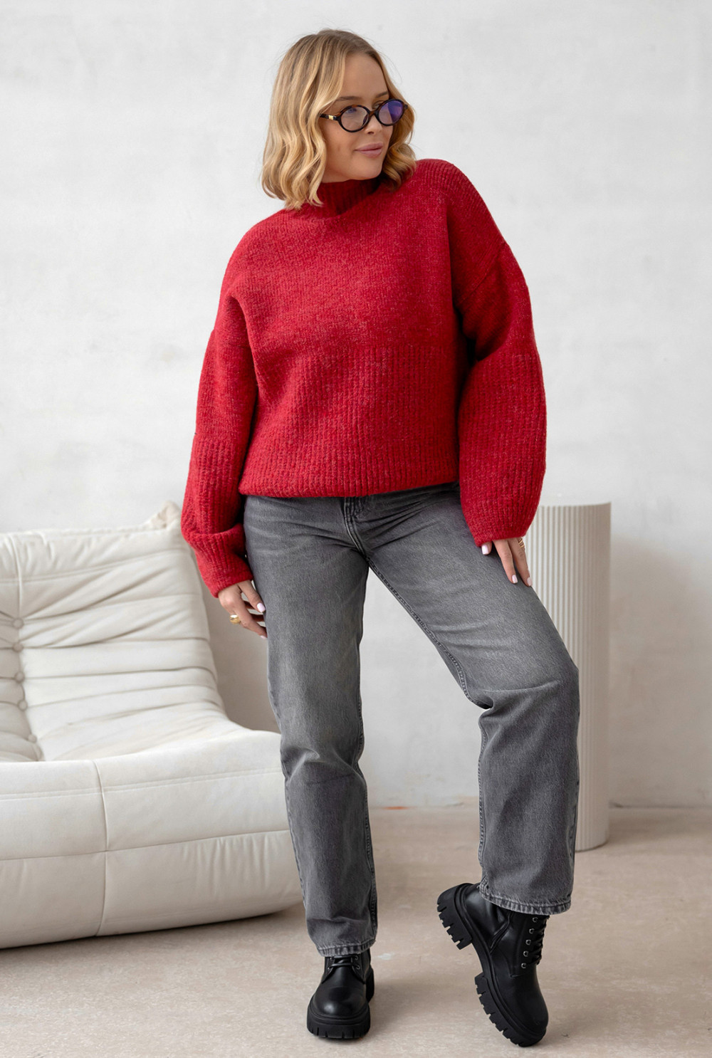 Miękki, przyjemny w dotyku sweterek z dodatkiem wełny. Model o lekko skróconym kroju i delikatnie zaokrąglonym dekolcie pięknie układa się na sylwetce. Charakteru dodają mu szersze rękawy zakończone ściągaczami, takimi samymi jak dół swetra.