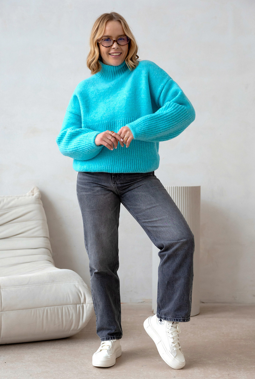 Miękki, przyjemny w dotyku sweterek z dodatkiem wełny. Model o lekko skróconym kroju i delikatnie zaokrąglonym dekolcie pięknie układa się na sylwetce. Charakteru dodają mu szersze rękawy zakończone ściągaczami, takimi samymi jak dół swetra.
